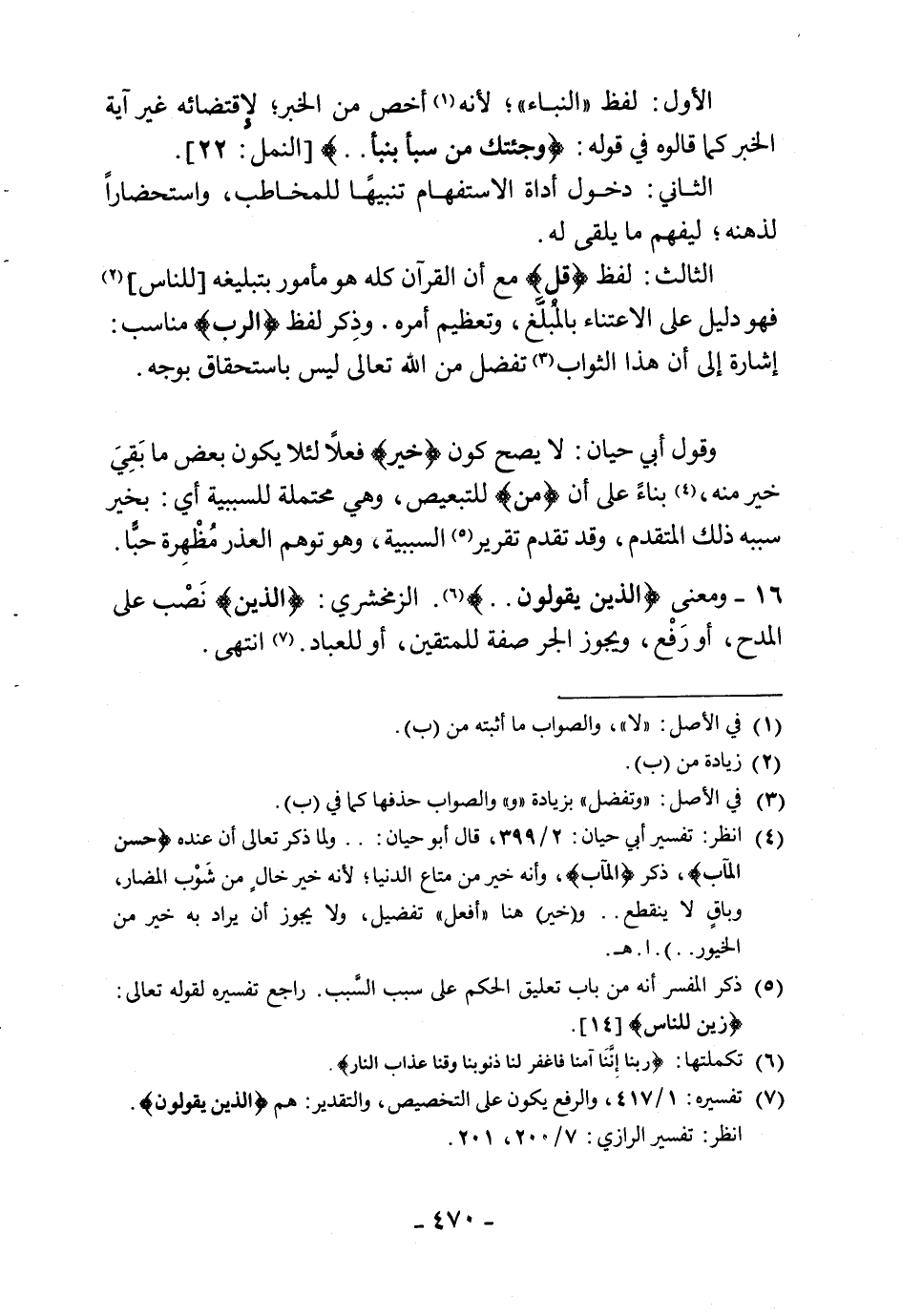 16 - ومعنى (الذين يقولون. .) الزمخشري: (الذين) نَصْب على المدح، أو رَفْع، ويجوز الجر صفة للمتقين، أو للعباد. انتهى.