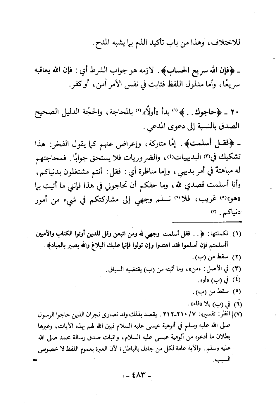 - (فإن اللَّه سريع الحساب). لازمه هو جواب الشرط أي: فإن الله يعاقبه سريعًا، وأما مدلول اللفظ فثابت في نفس الأمر آمن، أو كفر.