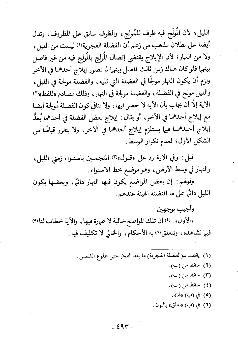 الليل؛ لأن المُولَج فيه ظرف للمُولج، والظرف سابق على المظروف، وتدل أيضا على بطلان مذهب من زعم أن الفضلة الفجرية ليست من الليل، ولا من النهار؛ لأن الإِيلاج يقتضي اتصال المُولج بالمُولج فيه من غير فاصل بينهما فلو كان هناك زمن ثالث فاصل بينهما لما تصور إيلاج أحدهما في الآخر ولزم أن يكون النهار مولجًا في الفضلة التي تليه، والفضلة مولجة في الليل، والليل مولج في الفضلة، والفضلة مولجة في النهار، وذلك مصادم للفظ الآية إلّا أن يجاب بأن الآية لا حصر فيها، ولا تنافي كون الفضلة مُولجة أيضا مع إيلاج أحدهما في الآخر، أو يقال: إيلاج بعض الفضلة في أحدهما يُعدُّ إيلاج أحدهما فيما يستلزم إيلاج أحدهما في الآخر، ولا يتقرر قياسًا من الشكل الأول؛ لعدم تكرار الوسط.