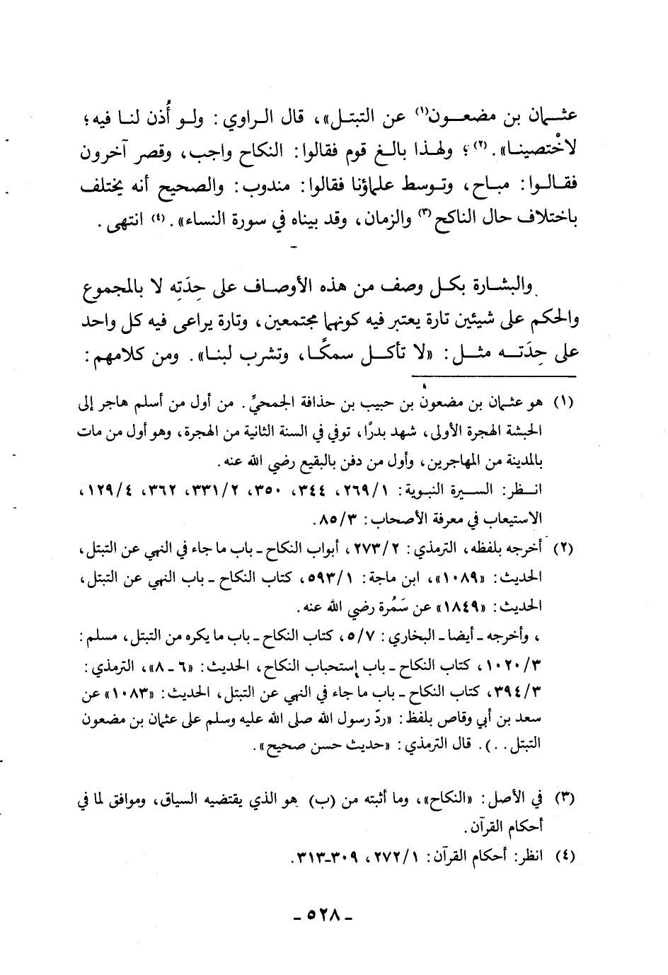 عثمان بن مضعون عن التبتل "، قال الراوي: ولو أُذن لنا فيه لاخْتصينا ". ولهذا بالغ قوم فقالوا: النكاح واجب، وقصر آخرون فقالوا: مباح، وتوسط علماؤنا فقالوا: مندوب: والصحيح أنه يختلف باختلاف حال الناكح والزمان، وقد بيناه فِي سورة النساء ". انتهى.