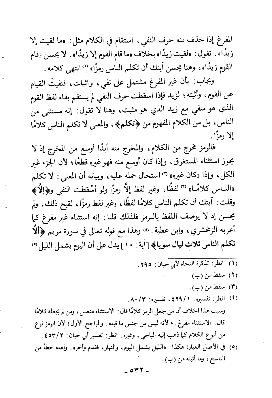المفرغ إذا حذف منه حرف النفي، استقام في الكلام مثل: " ما لقيت إلا زيدًا ". تقول: " لقيت زيدًا " بخلاف " ما قام القوم إلا زيدًا ". لا يحسن " قام القوم زيدًا "، وهنا يحسن آيتك أن تكلم الناس رمزًا " انتهى كلامه.