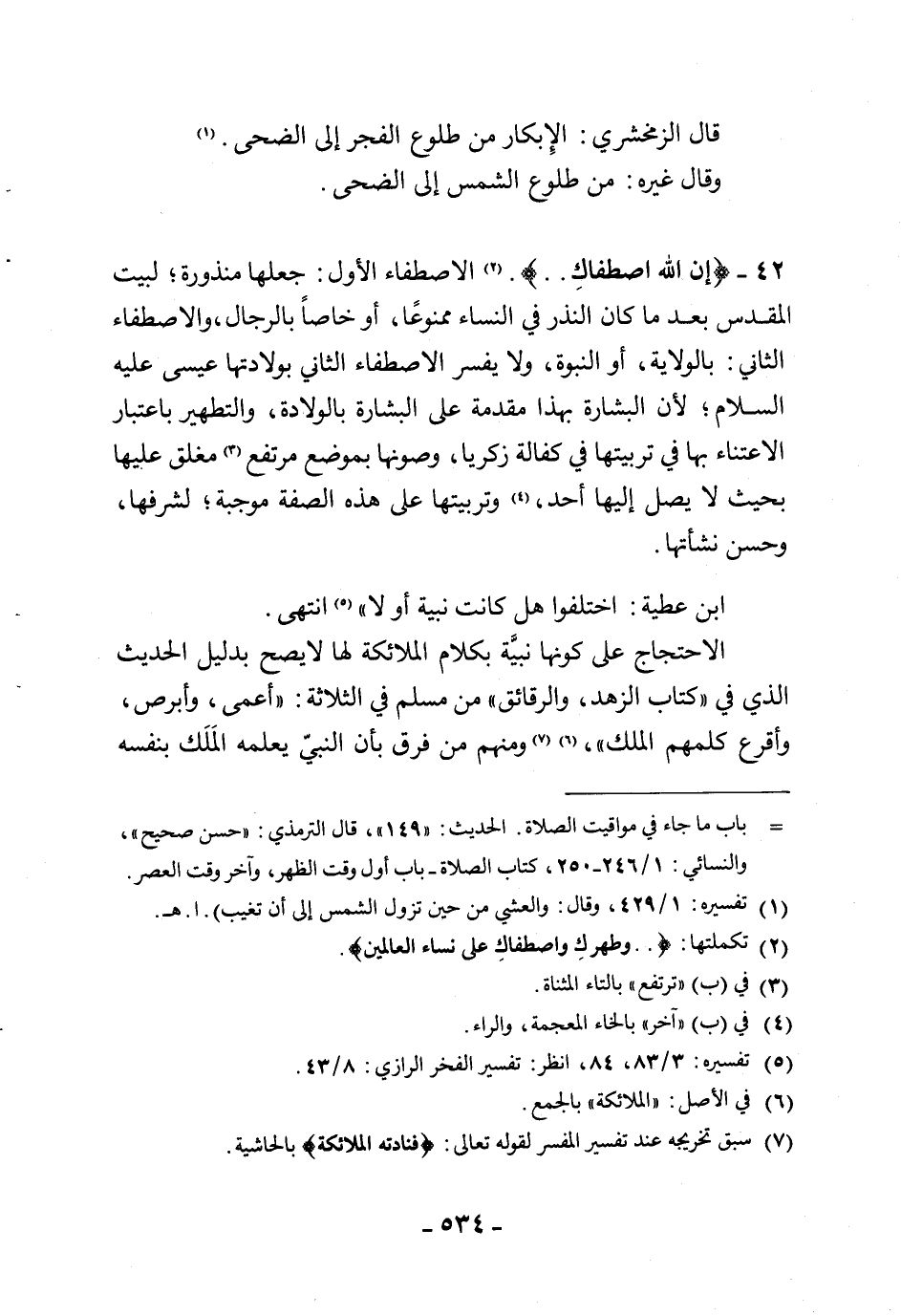 42 - (إن اللَّه اصطفاكِ. .). الاصطفاء الأول: جعلها منذورة لبيت المقدس بعد ما كان النذر في النساء ممنوعًا، أو خاصاً بالرجال، والاصطفاء الثاني: بالولاية، أو النبوة، ولا يفسر الاصطفاء الثاني بولادتها عيسى عليه السلام؛ لأن البشارة بهذا مقدمة على البشارة بالولادة، والتطهير باعتبار الاعتناء بها في تربيتها في كفالة زكريا، وصونها بموضع مرتفع مغلق عليها بحيث لا يصل إليها أحد، وتربيتها على هذه الصفة موجبة لشرفها، وحسن نشأتها.