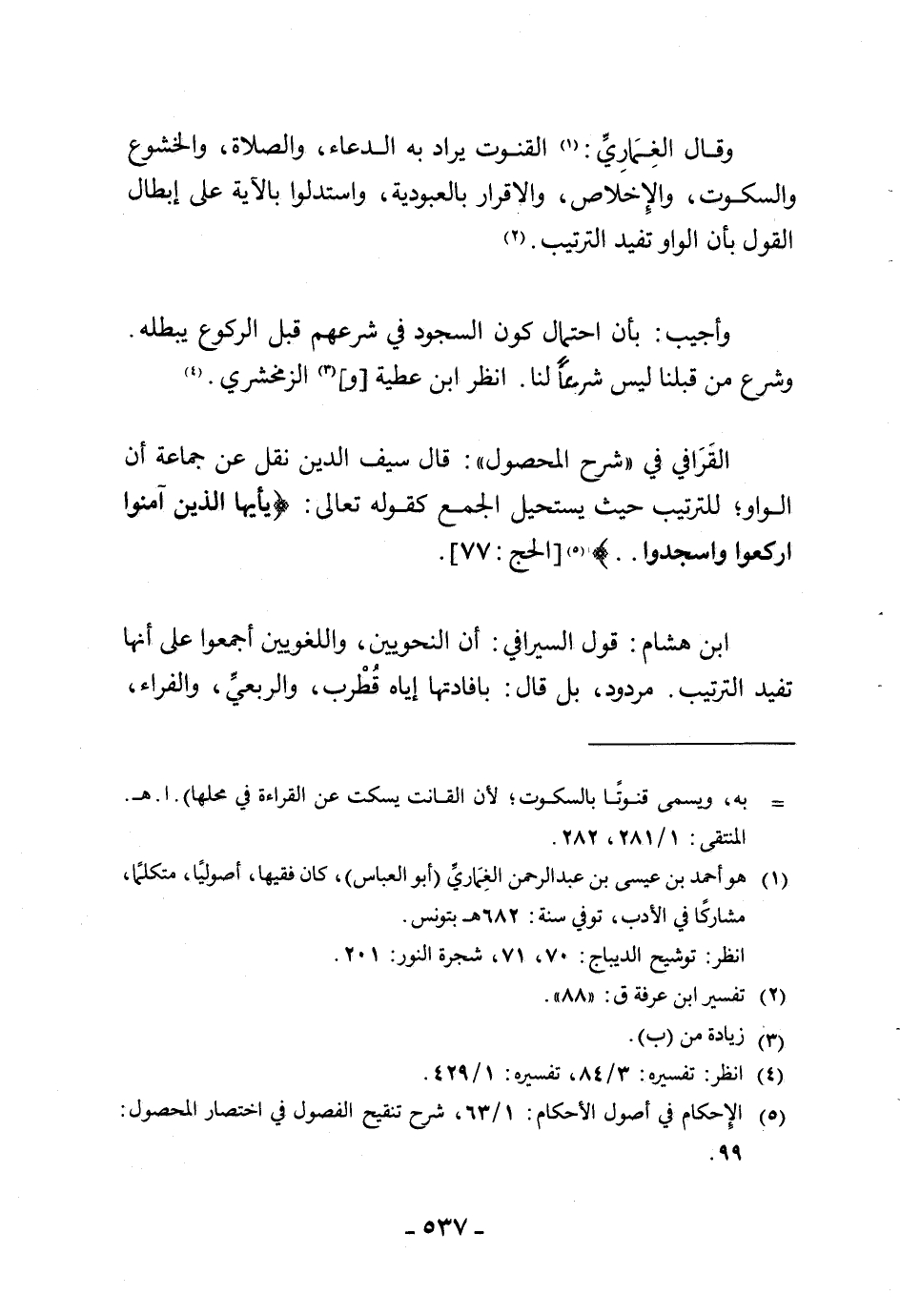 وقال الغِمَارِيِّ: القنوت يراد به الدعاء، والصلاة، والخشوع والسكوت، والإِخلاص، والإقرار بالعبودية، واستدلوا بالآية على إبطال القول بأن الواو تفيد الترتيب.