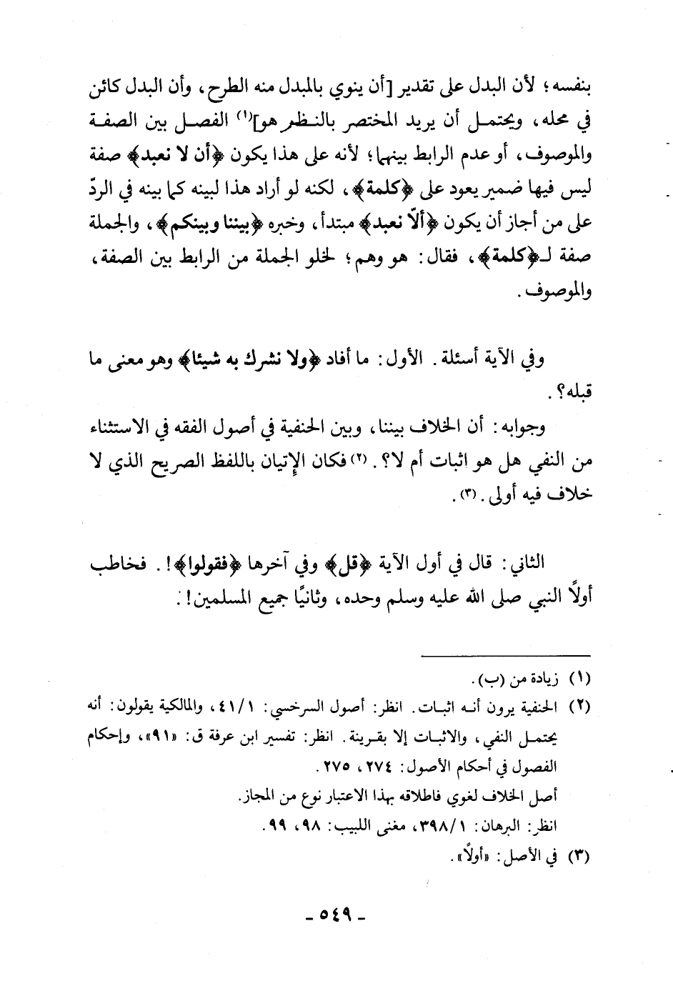 بنفسه، لأن البدل على تقدير أن ينوي بالمبدل منه الطرح، وأن البدل كائن في محله، ويحتمل أن يريد المختصر بالنظر هو الفصل بين الصفة والموصوف، أو عدم الرابط بينهما؛ لأنه على هذا يكون (أن لا نعبد) صفة ليس فيها ضمير يعود على (كلمة)، لكنه لو أراد هذا لبينه كما بينه في الردّ على من أجاز أن يكون (ألّا نعبد) مبتدأ، وخبره (بيننا وبينكم)، والجملة صفة لـ (كلمة)، فقال: هو وهم؛ لخلو الجملة من الرابط بين الصفة، والموصوف.