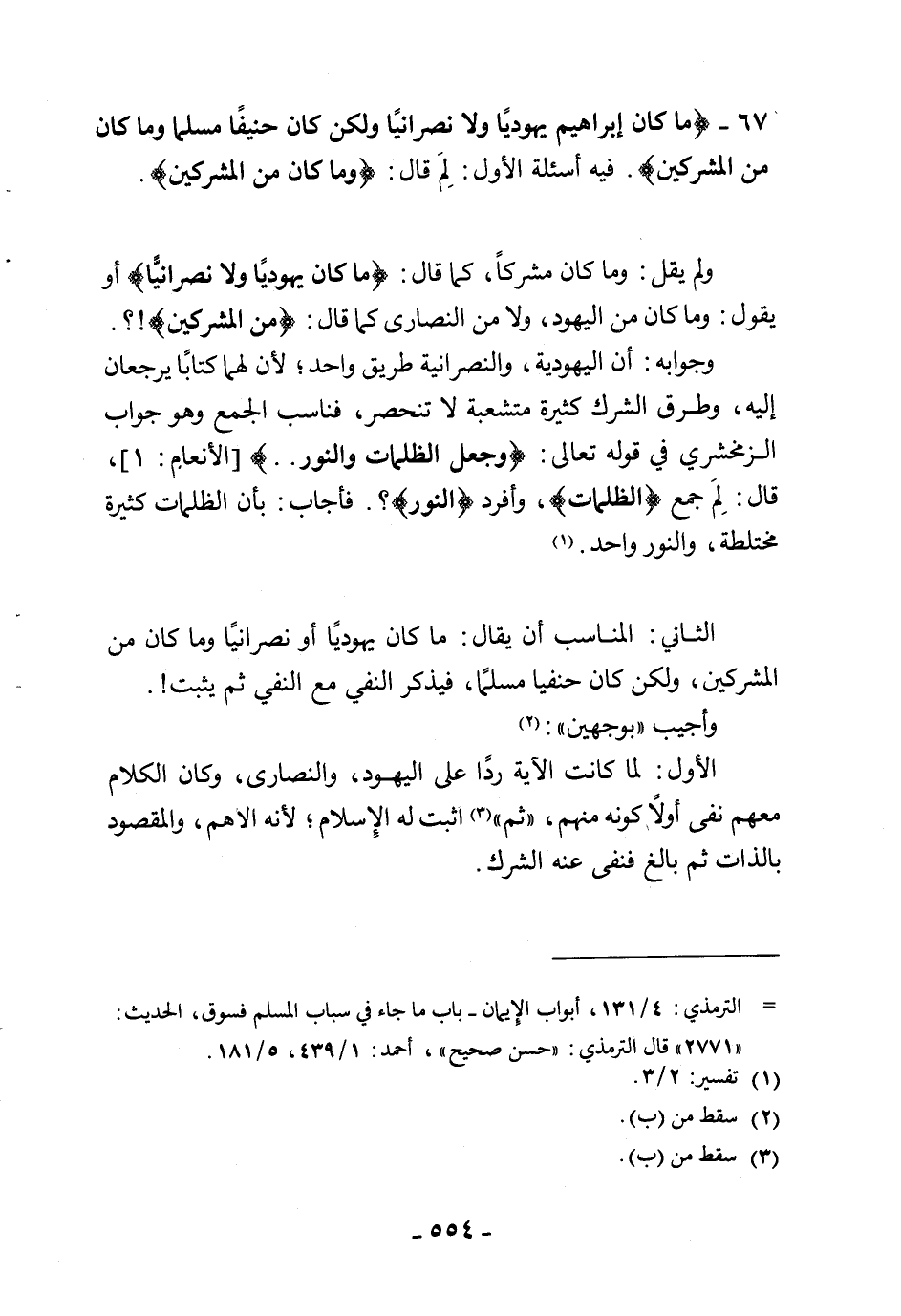 67 - (مَا كَانَ إِبْرَاهِيمُ يَهُودِيًّا وَلَا نَصْرَانِيًّا وَلَكِنْ كَانَ حَنِيفًا مُسْلِمًا وَمَا كَانَ مِنَ الْمُشْرِكِينَ). فيه أسئلة الأول: قال: (وما كان من المشركين).