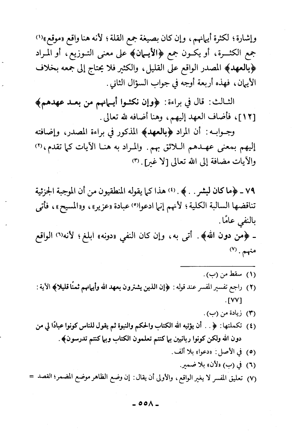 79 - (ما كان لبشر. .). هذا كما يقوله المنطقيون من أن الموجبة الجزئية تناقضها السالبة الكلية؛ لأنهم إنما ادعوا عبادة " عزير "، و " المسيح "، فأتى بالنفي عامًا.