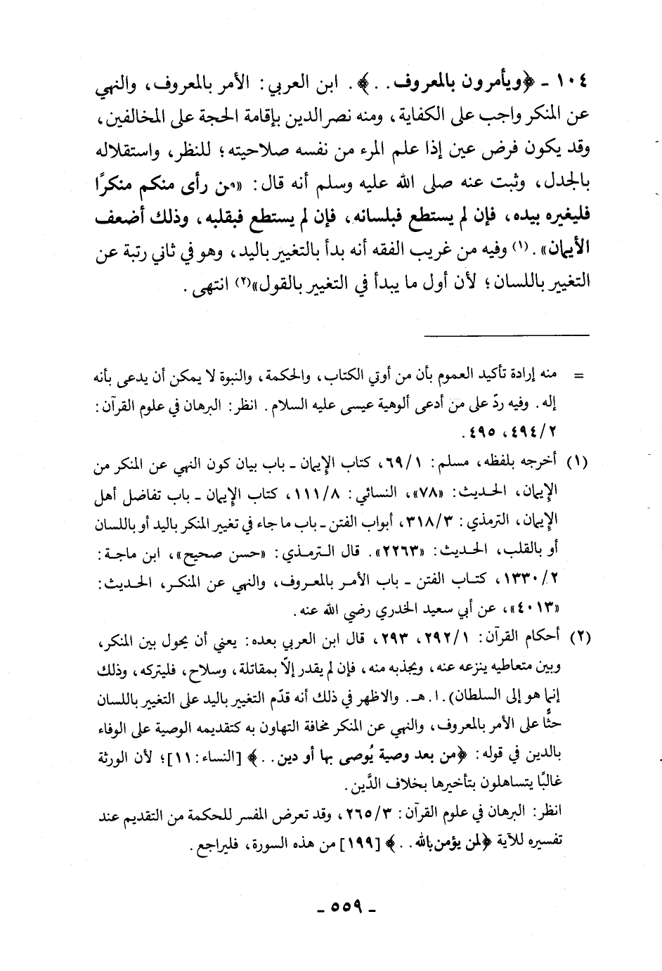 104 - (ويأمرون بالمعروف. .). ابن العربي: الأمر بالمعروف، والنهي عن المنكر واجب على الكفاية، ومنه نصر الدين بإقامة الحجة على المخالفين، وقد يكون فرض عين إذا علم المرء من نفسه صلاحيته للنظر، واستقلاله بالجدل، وثبت عنه صلى الله عليه وسلم أنه قال: " من رأى منكم منكرًا فليغيره بيده، فإن لم يستطع فبلسانه، فإن لم يستطع فبقلبه، وذلك أضعف الإيمان ". وفيه من غريب الفقه أنه بدأ بالتغيير باليد، وهو في ثاني رتبة عن التغيير باللسان، لأن أول ما يبدأ في التغيير بالقول " انتهى.