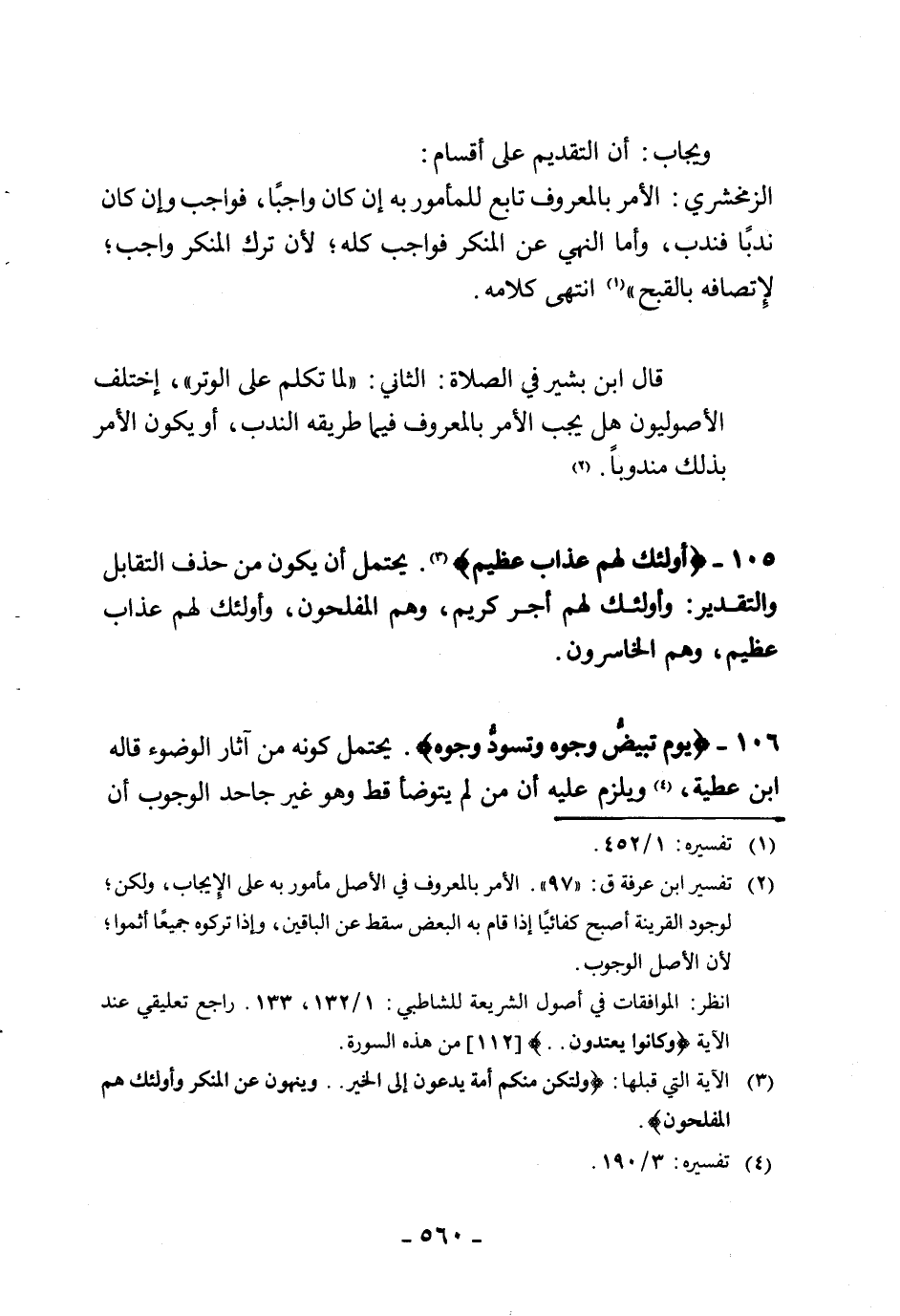 105 - (أولئك لهم عذاب عظيم). يحتمل أن يكون من حذف التقابل والتقدير: وأولئك لهم أجر كريم، وهم المفلحون، وأولئك لهم عذاب عظيم، وهم الخاسرون.