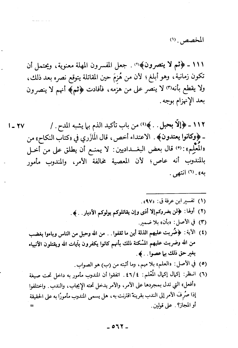112 - (إلَّا بحبلٍ. .) من باب تأكيد الذم بما يشبه المدح (وكانوا يعتدون). الاعتداء أخص، قال المَازَري في " كتاب النكاح " من " المُعْلِم ": قال بعض البغداديين: لا يمنع أن يطلق على من أخل بالمندوب أنه عاص؛ لأن المعصية مخالفة الأمر، والمندوب مأمور به ". انتهى.