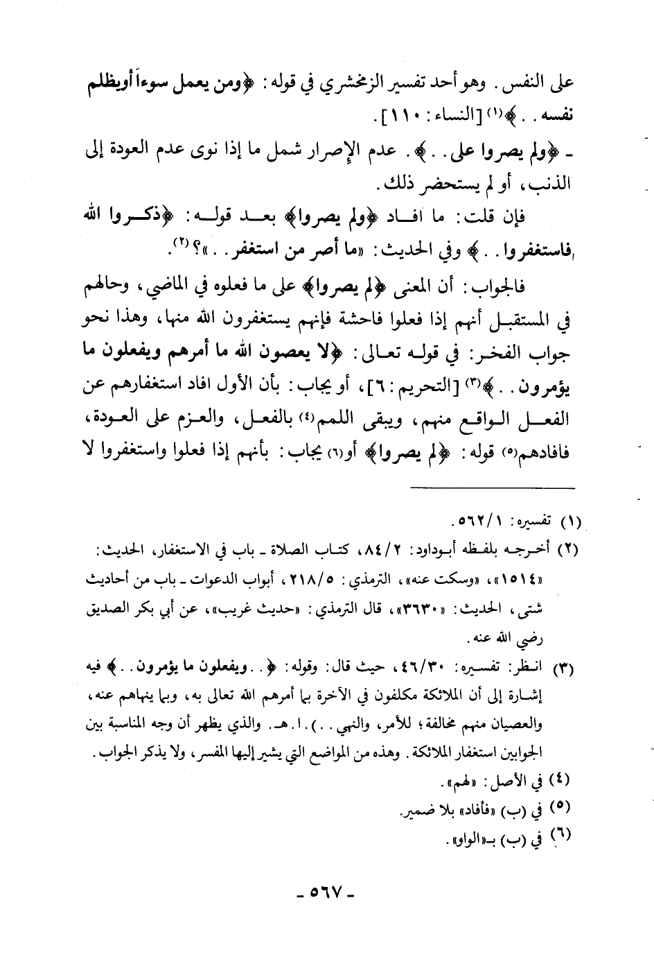 فإن قلت: ما أفاد (ولم يصروا) بعد قوله: (ذكروا اللَّه فاستغفروا. .) وفي الحديث: " ما أصر من استغفر. . "؟.