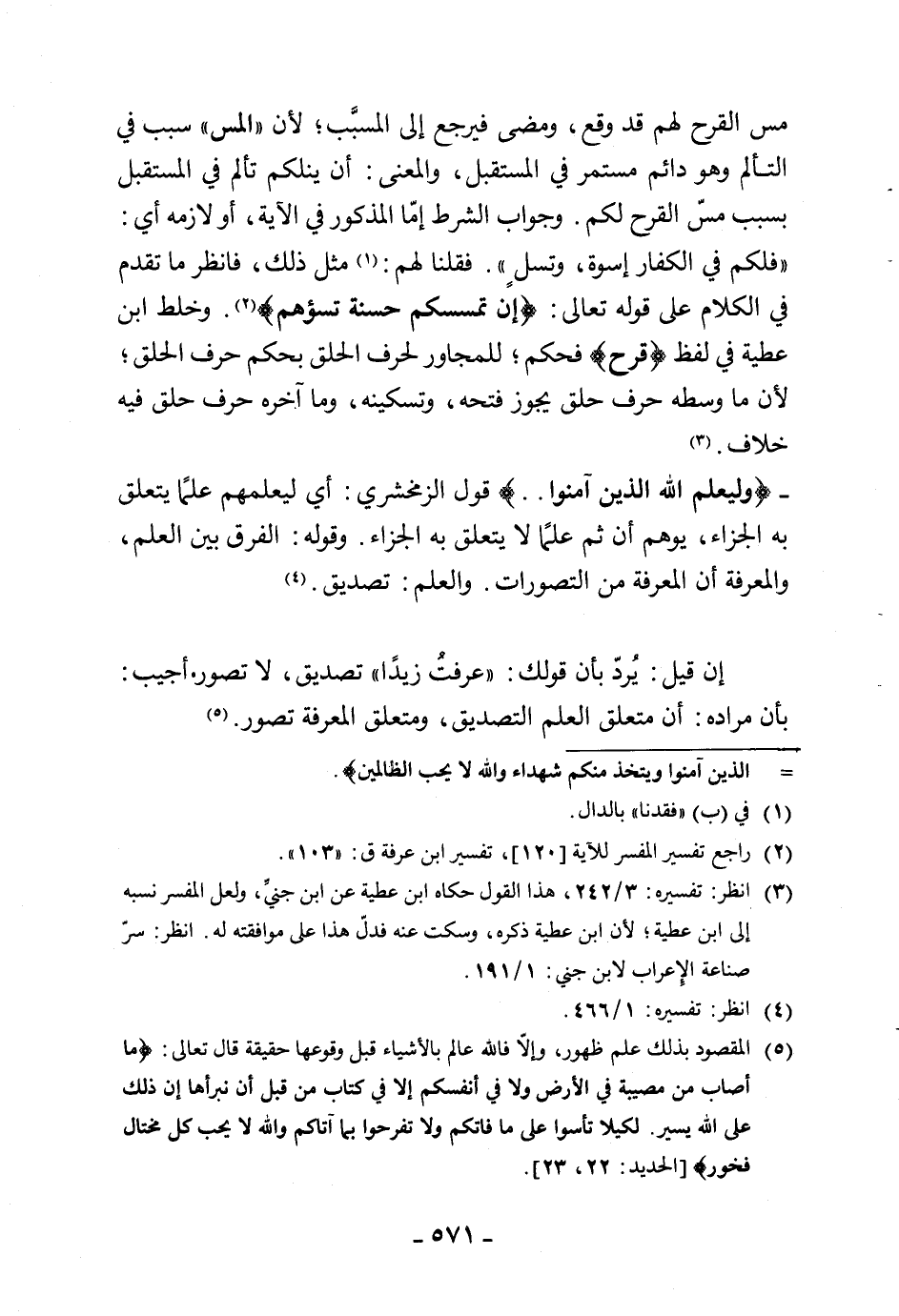 - (وليعلم الله الذين آمنوا. .) قول الزمخشري: أي ليعلمهم علمًا يتعلق به الجزاء، يوهم أن ثم علمًا لا يتعلق به الجزاء. وقوله: الفرق بين العلم، والمعرفة أن المعرفة من التصورات. والعلم: تصديق.