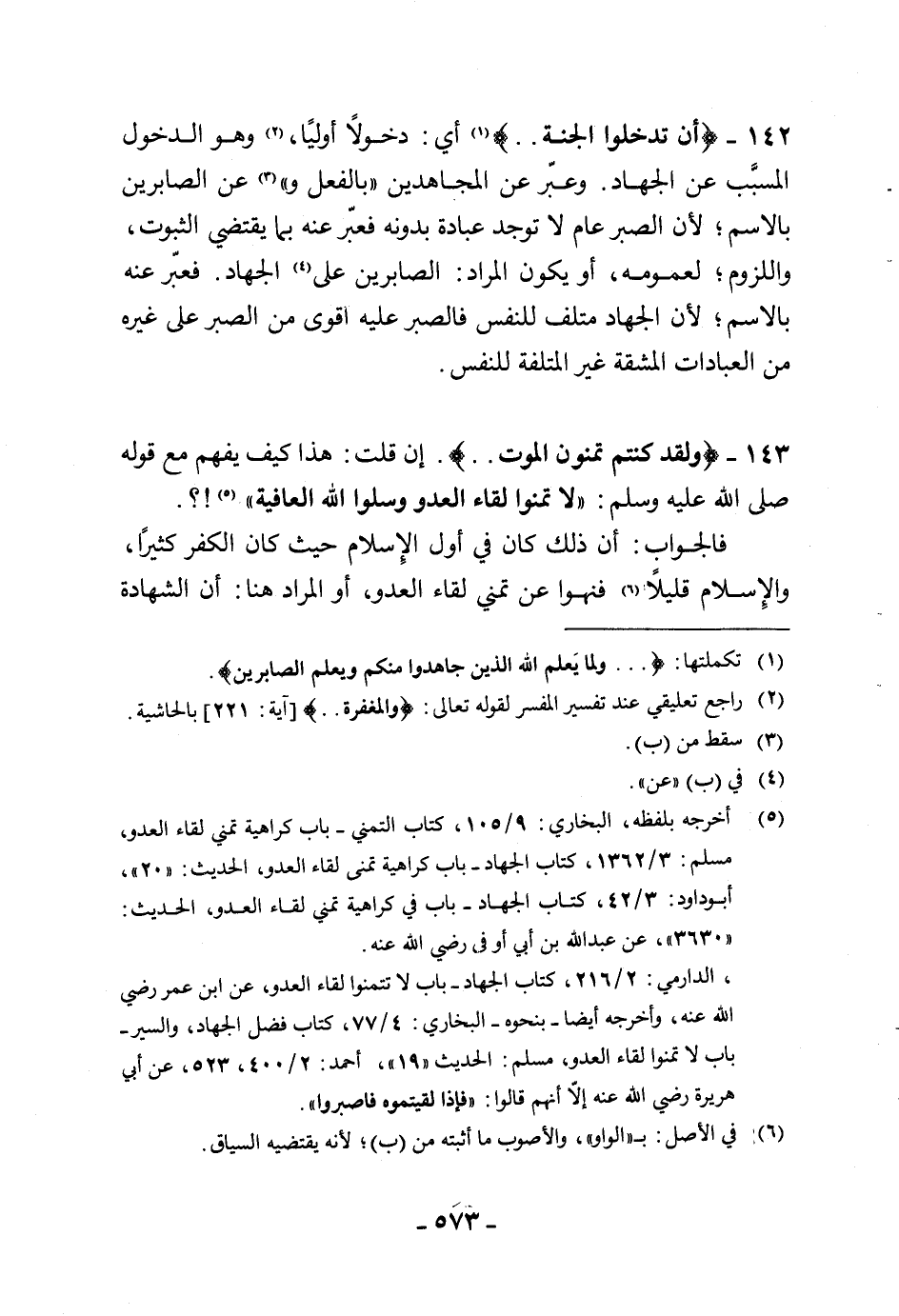 142 - (أن تدخلوا الجنة. .) أي: دخولًا أوليًا، وهو الدخول المسبَّب عن الجهاد. وعبّر عن المجاهدين " بالفعل و " عن الصابرين بالاسم؛ لأن الصبر عام لا توجد عبادة بدونه فعّبر عنه بما يقتضي الثبوت، واللزوم لعمومه، أو يكون المراد: الصابرين على الجهاد. فعبّر عنه بالاسم؛ لأن الجهاد متلف للنفس فالصبر عليه أقوى من الصبر على غيره من العبادات المشقة غير المتلفة للنفس.