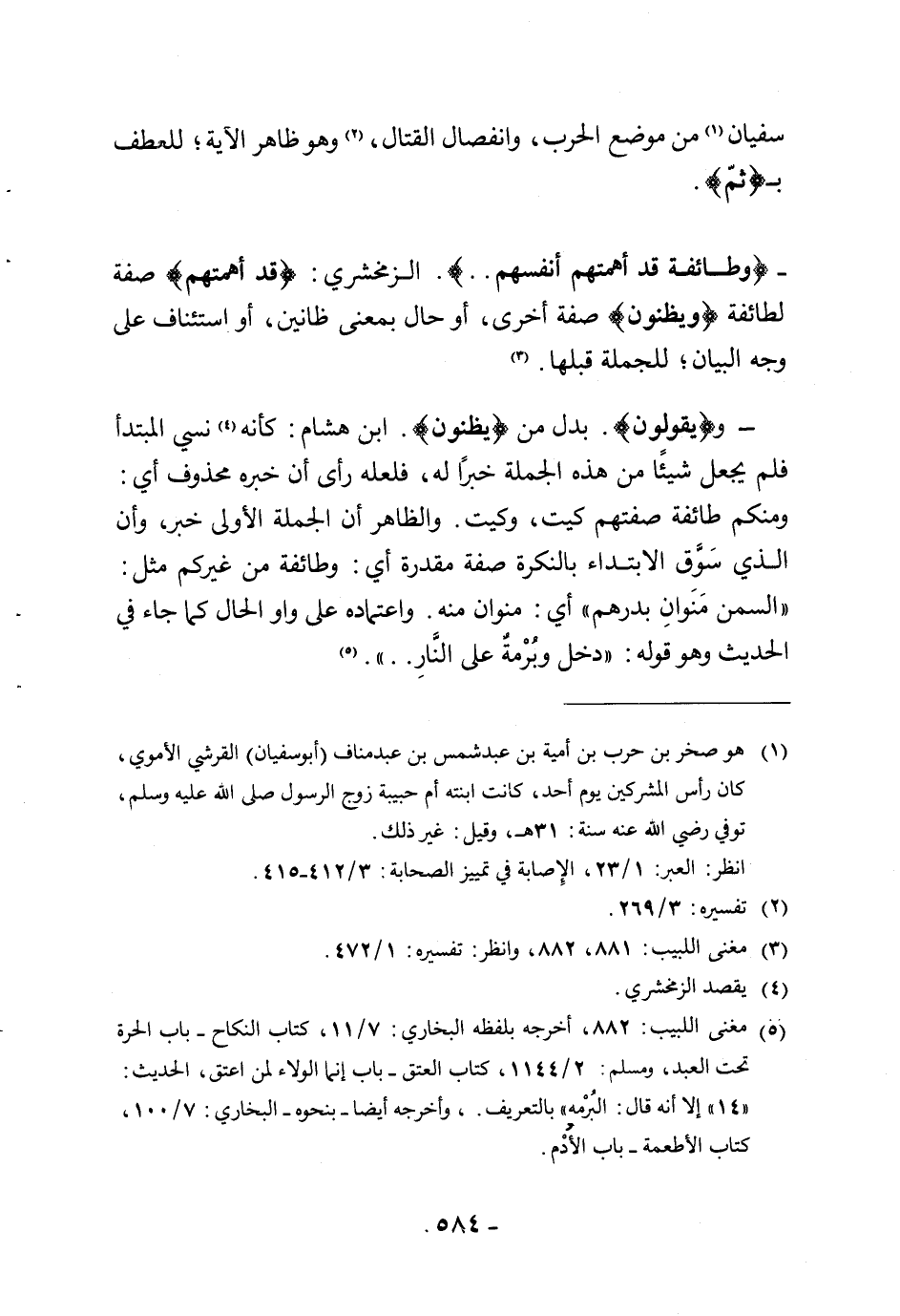 - (وطائفة قد أهمتهم أنفسهم. .). الزمخشري: (قد أهمتهم) صفة لـ (طائفة) و (يظنون) صفة أخرى، أو حال بمعنى ظانين، أو استئناف على وجه البيان للجملة قبلها.