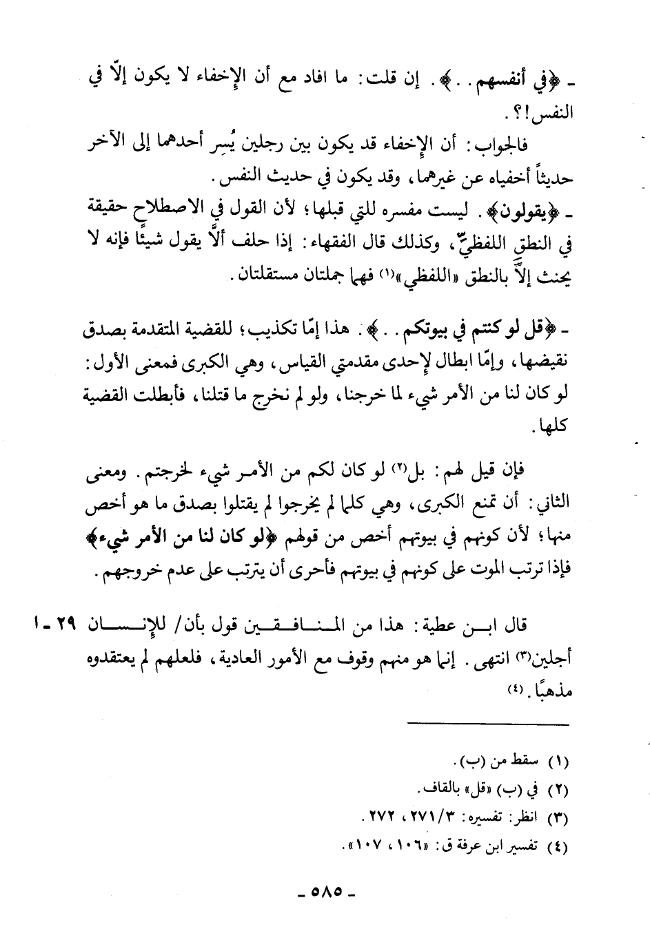 - (قل لو كنتم في بيوتكم. .) هذا إمّا تكذيب للقضية المتقدمة بصدق نقيضها، وإمّا إبطال لإِحدى مقدمتي القياس، وهي الكبرى فمعنى الأول: لو كان لنا من الأمر شيء لما خرجنا، ولو لم نخرج ما قتلنا، فأبطلت القضية كلها.