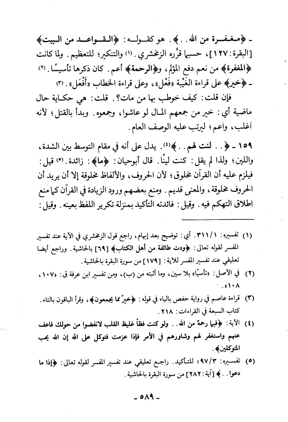 159 - . . (لِنْتَ لَهُمْ. .). يدل على أنه في مقام التوسط بين الشدة، واللين؛ ولذا لم يقل: كنت لينًا. قال أبو حيان: (ما): زائدة، قيل: فيلزم عليه أن القرآن مخلوق؛ لأن الحروف، والألفاظ مخلوقة إلا أن يريد أن الحروف مخلوقة، والمعنى قديم. ومنع بعضهم ورود الزيادة في القرآن كما منع إطلاق التهكم فيه. وقيل: فائدته التأكيد بمنزلة تكرير اللفظ بعينه. وقيل: