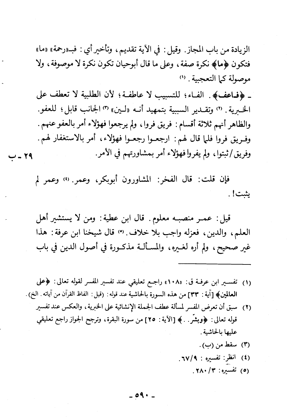 قيل: عمر منصبه معلوم. قال ابن عطية: ومن لا يستشير أهل العلم، والدين، فعزله واجب بلا خلاف. قال شيخنا ابن عرفة: هذا غير صحيح، ولم أره لغيره، والمسألة مذكورة في أصول الدين في باب