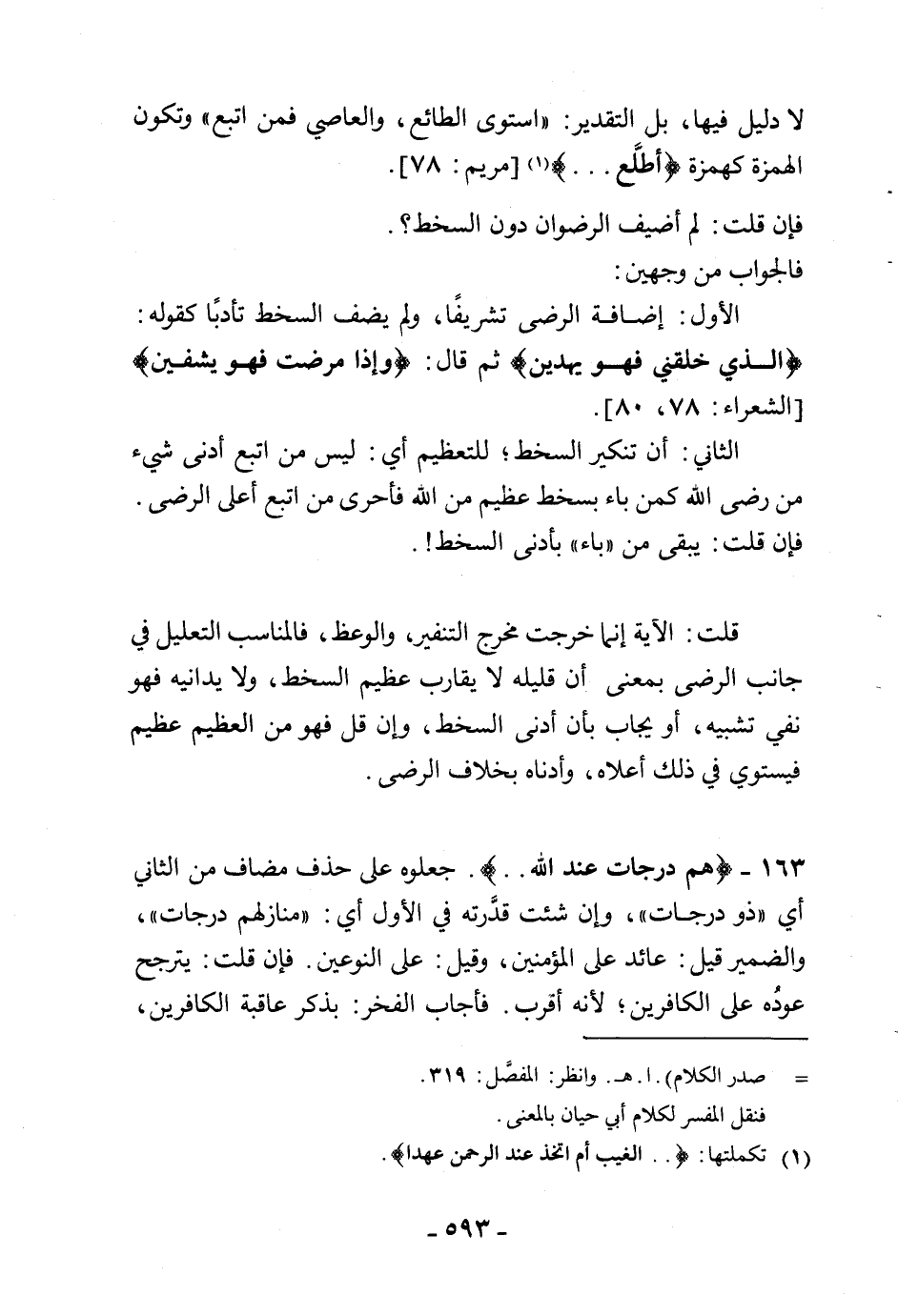 163 - (هم درجاتٌ عند اللَّهِ. .). جعلوه على حذف مضاف من الثاني أي " ذو درجات "، وإن شئت قدَّرته في الأول أي: " منازلهم درجات "، والضمير قيل: عائد على المؤمنين، وقيل: على النوعين. فإن قلت: يترجح عوده على الكافرين، لأنه أقرب. فأجاب الفخر: بذكر عاقبة الكافرين،