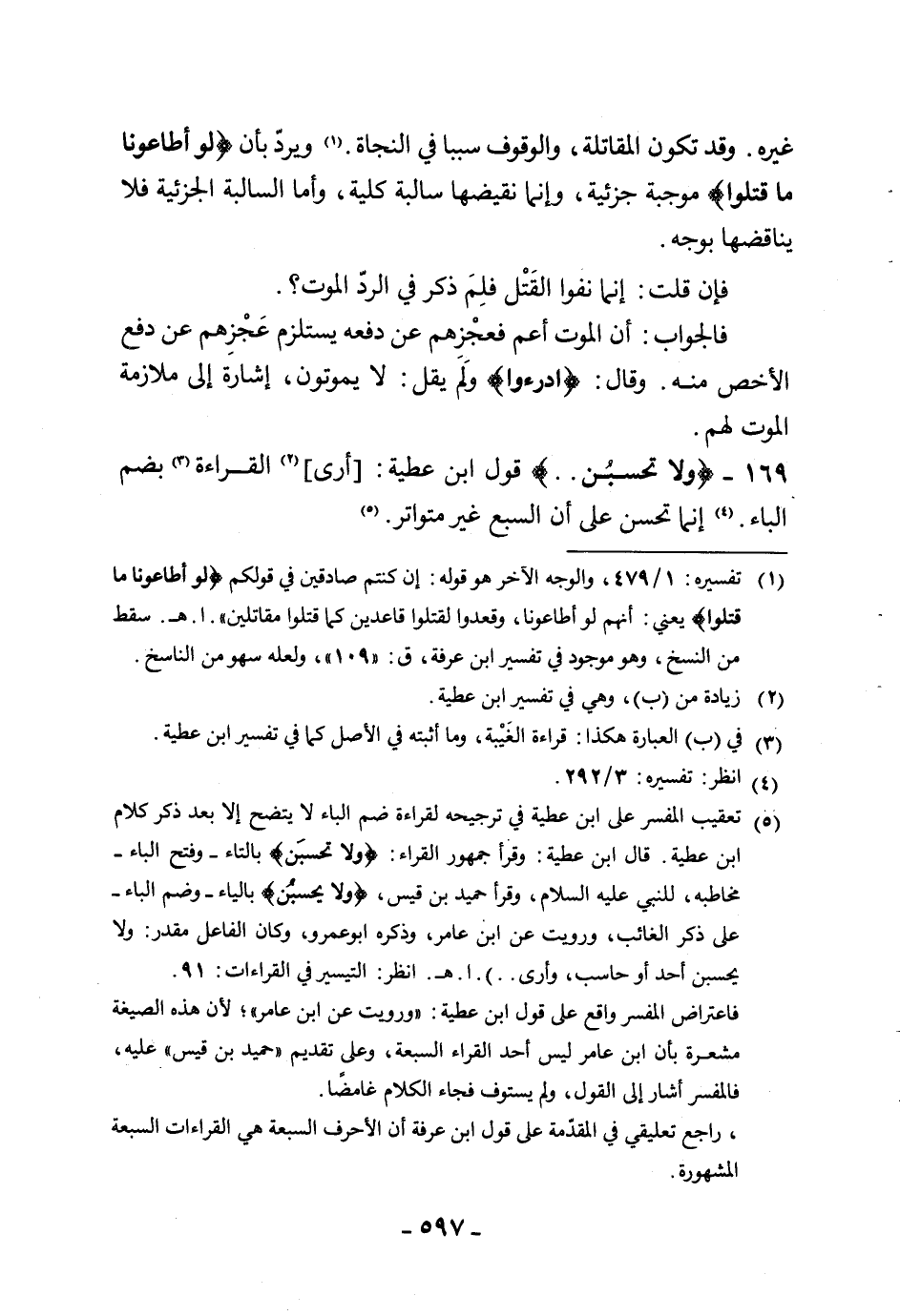 169 - (ولا تحسبُن. .) قول ابن عطية: أرى، القراءة بضم الباء. إنما تحسن على أن السبع غير متواتر.