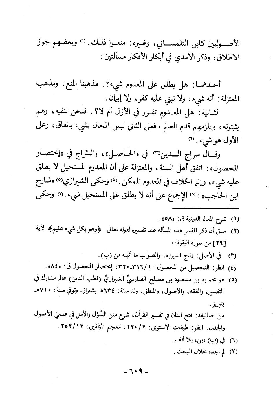 وقال سراج الدين في " الحاصل "، والسِّراج في " اختصار المحصول ": اتفق أهل السنة، والمعتزلة على أن المعدوم المستحيل لا يطلق عليه شيء، وإنما الخلاف في المعدوم الممكن. وحكى الشيرازي " شارح ابن الحاجب ": الإِجماع على أنه لا يطلق على المستحيل شيء. وحكى