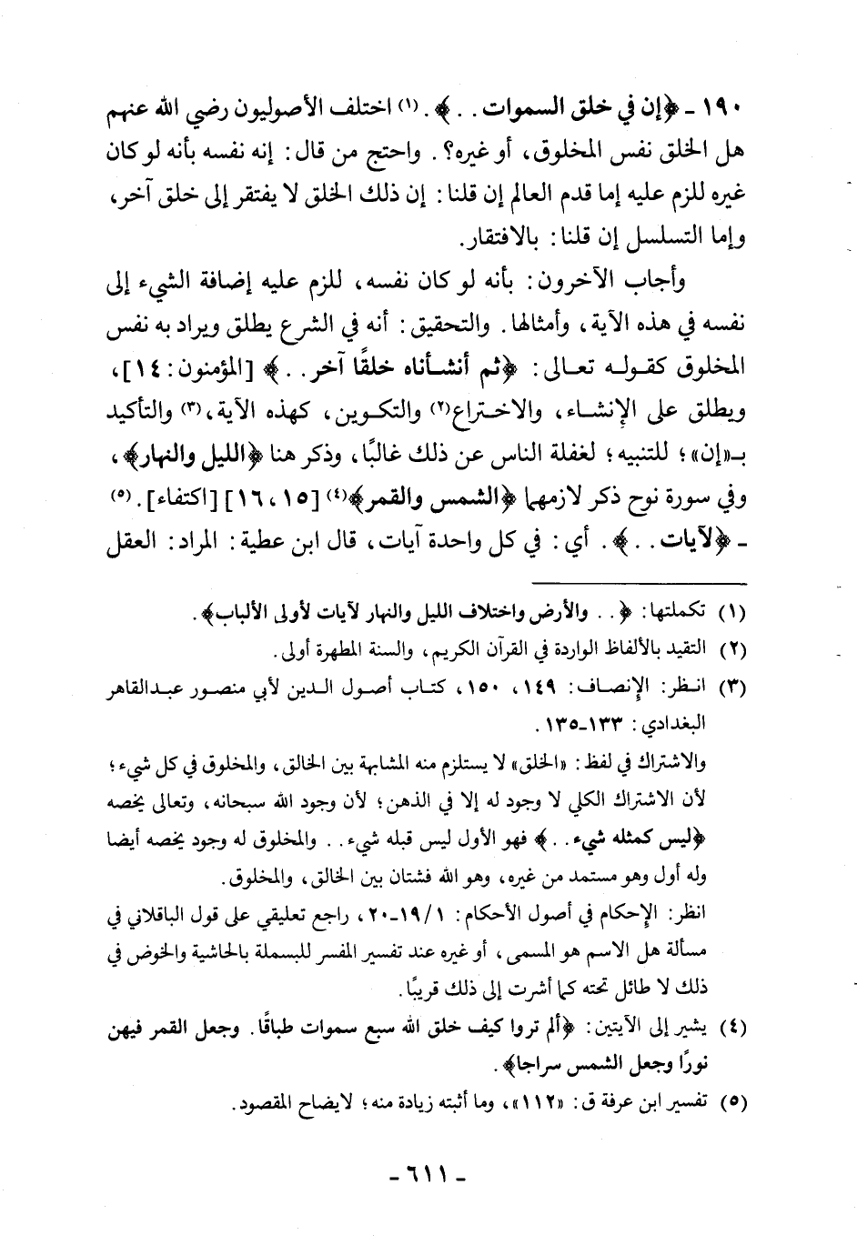 190 - (إن في خلق السماوات). اختلف الأصوليون رضي الله عنهم هل الخلق نفس المخلوق، أو غيره؟. واحتج من قال: إنه نفسه بأنه لو كان غيره للزم عليه إما قدم العالم إن قلنا: إن ذلك الخلق لا يفتقر إلى خلق آخر، وإما التسلسل إن قلنا: بالافتقار.