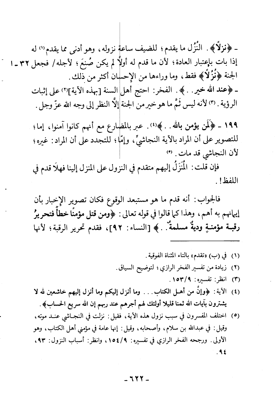 199 - (لَمَن يؤمن باللَّه. .). عبر بالمضارع مع أنهم كانوا آمنوا، إما للتصوير على أن المراد بالآية النجاشيِّ، وإما للتجدد على أن المراد: غيره؛ لأن النجاشي قد مات.
