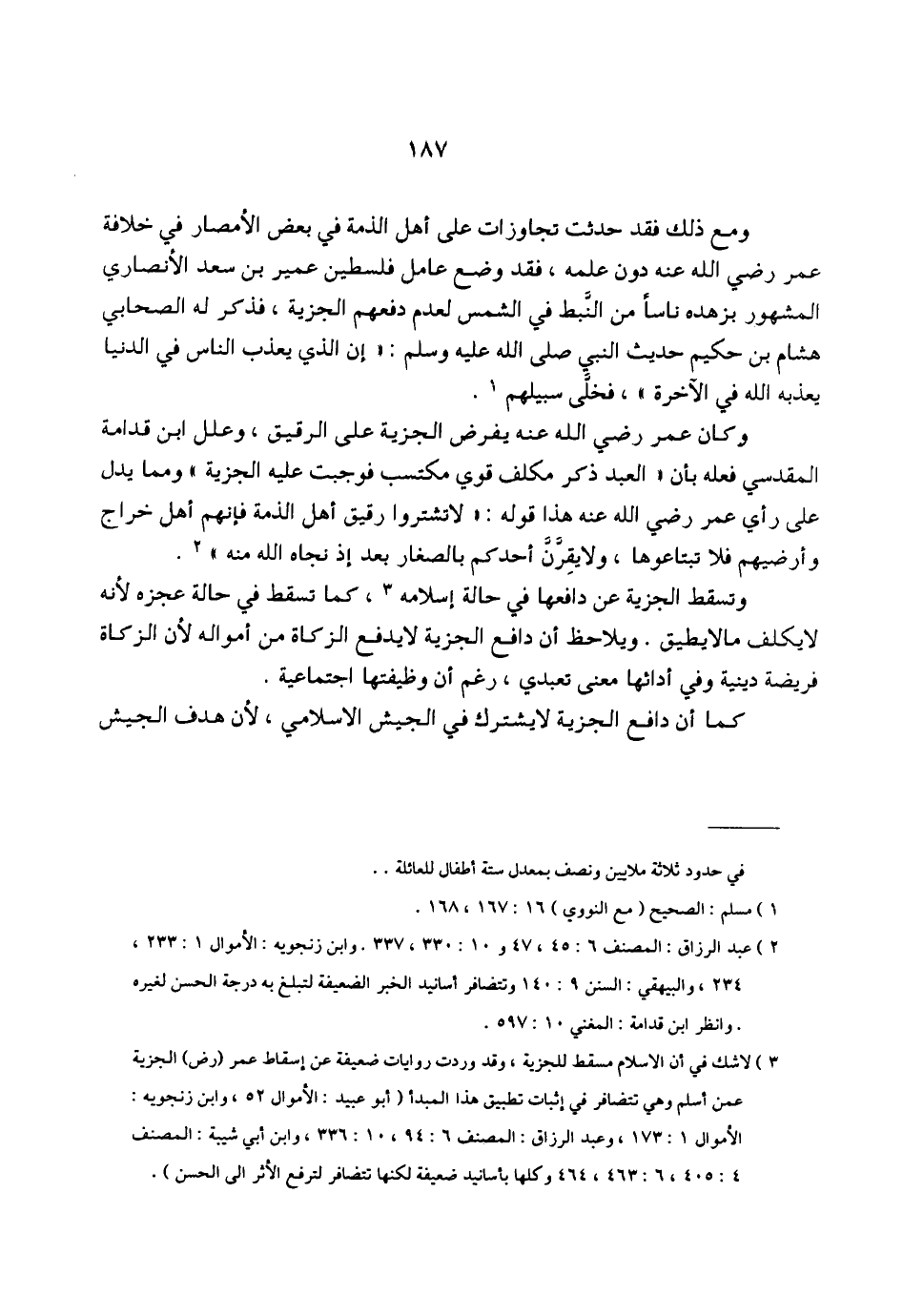 (¬3) لا شك في أن الإسلام مسقط للجزية، وقد وردت روايات ضعيفة عن إسقاط عمر (رض) الجزية عمن أسلم وهي تتضافر في إثبات تطبيق هذا المبدأ (أبو عبيد: الأموال 52، وابن زنجويه: الأموال 1: 173، وعبد الرزاق: المصنف 6: 14، 10: 336، وابن أبي شيبة: المصنف 4: 405، 6: 463، 464 وكلها بأسانيد ضعيفة لكنها تتضافر لترفع الأثر إلى الحسن).