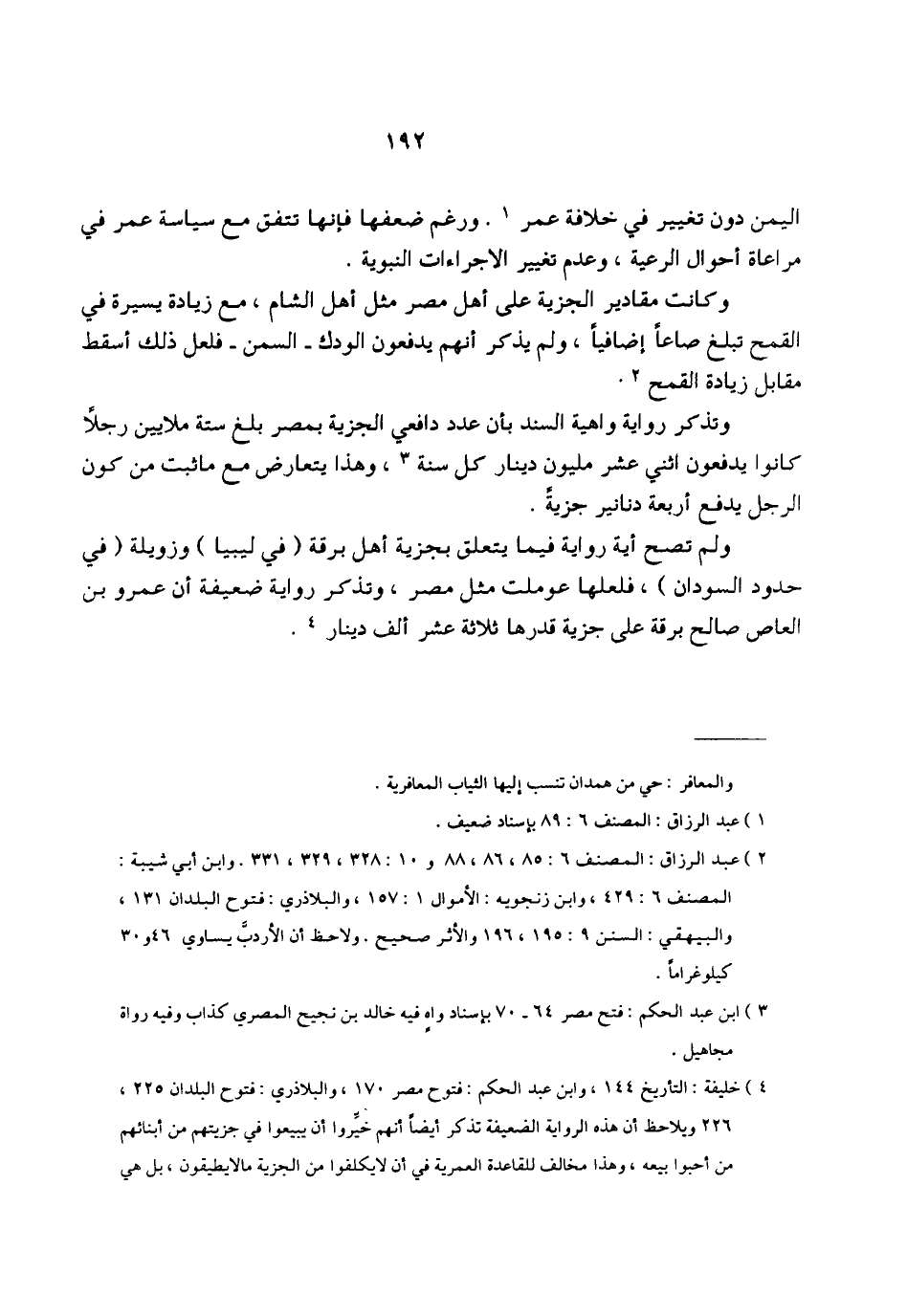 (¬4) خليفة: التأريخ 144، وابن عبد الحكم: فتوح مصر 170، والبلاذري: فتوح البلدان 225، 226 ويلاحظ أن هذه الرواية الضعيفة تذكر أيضاً أنهم خيروا أن يبيعوا في جزيتهم من أبنائهم من أحبوا بيعه، وهذا مخالف للقاعدة العمرية في أن لا يكلفوا من الجزية مالا يطيقون، بل هي