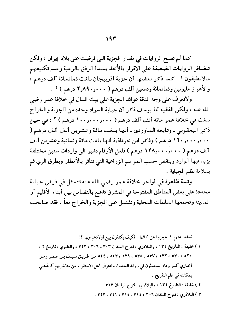 كما لم تصح الروايات في مقدار الجزية التي فرضت على بلاد إيران، ولكن تتضافر الروايات الضعيفة على الإقرار بالأخذ بمبدأ الرفق بالرعية وعدم تكليفهم مالا يطيقون (¬1). كما ذكر بعضها أن جزية أذربيجان بلغت ثمانمائة ألف درهم، والأهواز مليونين وثمانمائة وتسعين ألف درهم (000 و (890) و2 درهم) (¬2).
