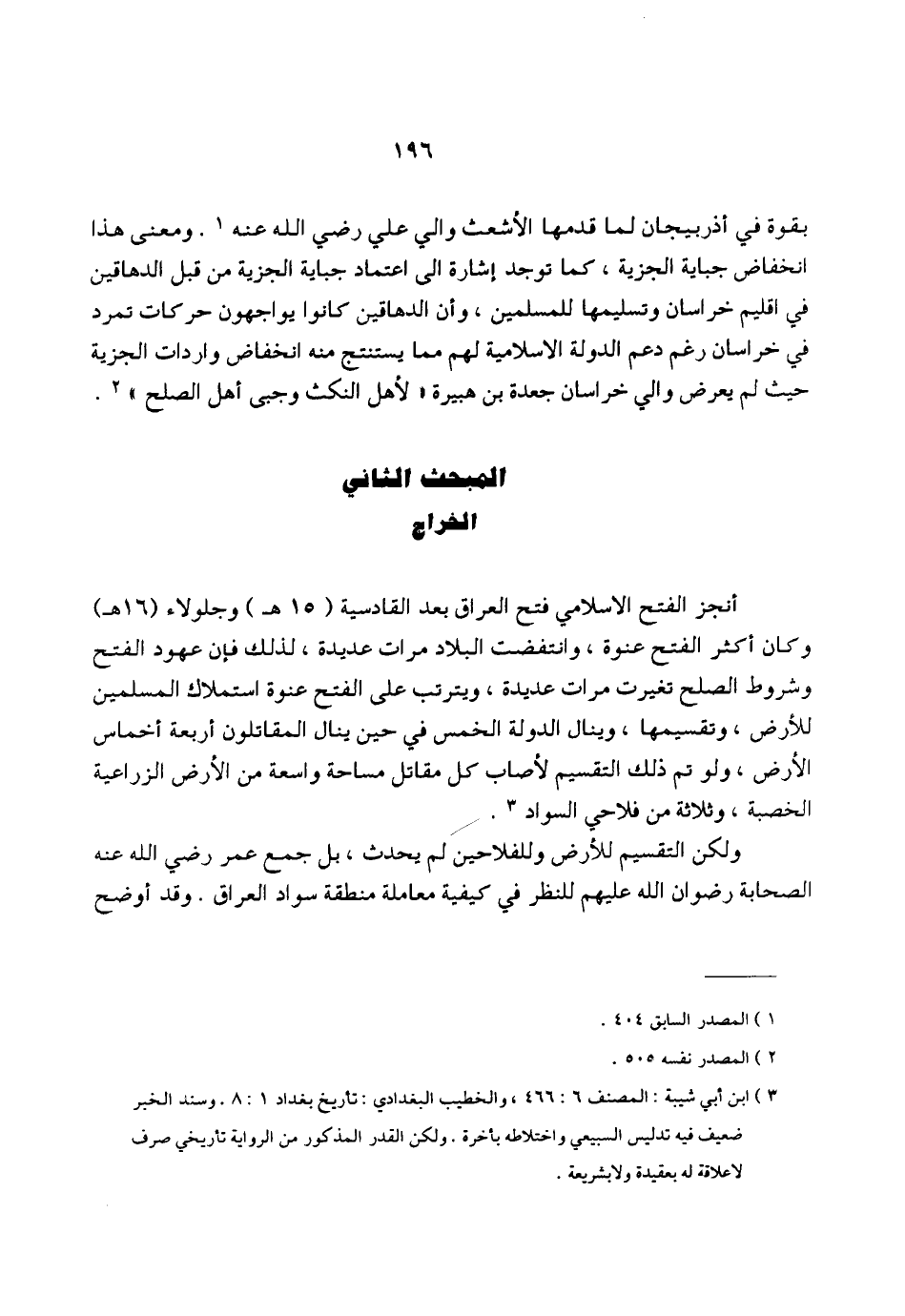أنجز الفتح الإسلامي فتح العراق بعد القادسية (15 هـ) وجلولاء (16 هـ) وكان أكثر الفتح عنوة، وانتفضت البلاد مرات عديدة، لذلك فإن عهود الفتح وشروط الصلح تغيرت مرات عديدة، ويترتب على الفتح عنوة استملاك المسلمين للأرض، وتقسيمها، وينال الدولة الخمس في حين ينال المقاتلون أربعة أخماس الأرض، ولو تم ذلك التقسيم لأصاب كل مقاتل مساحة واسعة من الأرض الزراعية الخصبة، وثلاثة من فلاحي السواد (¬3).