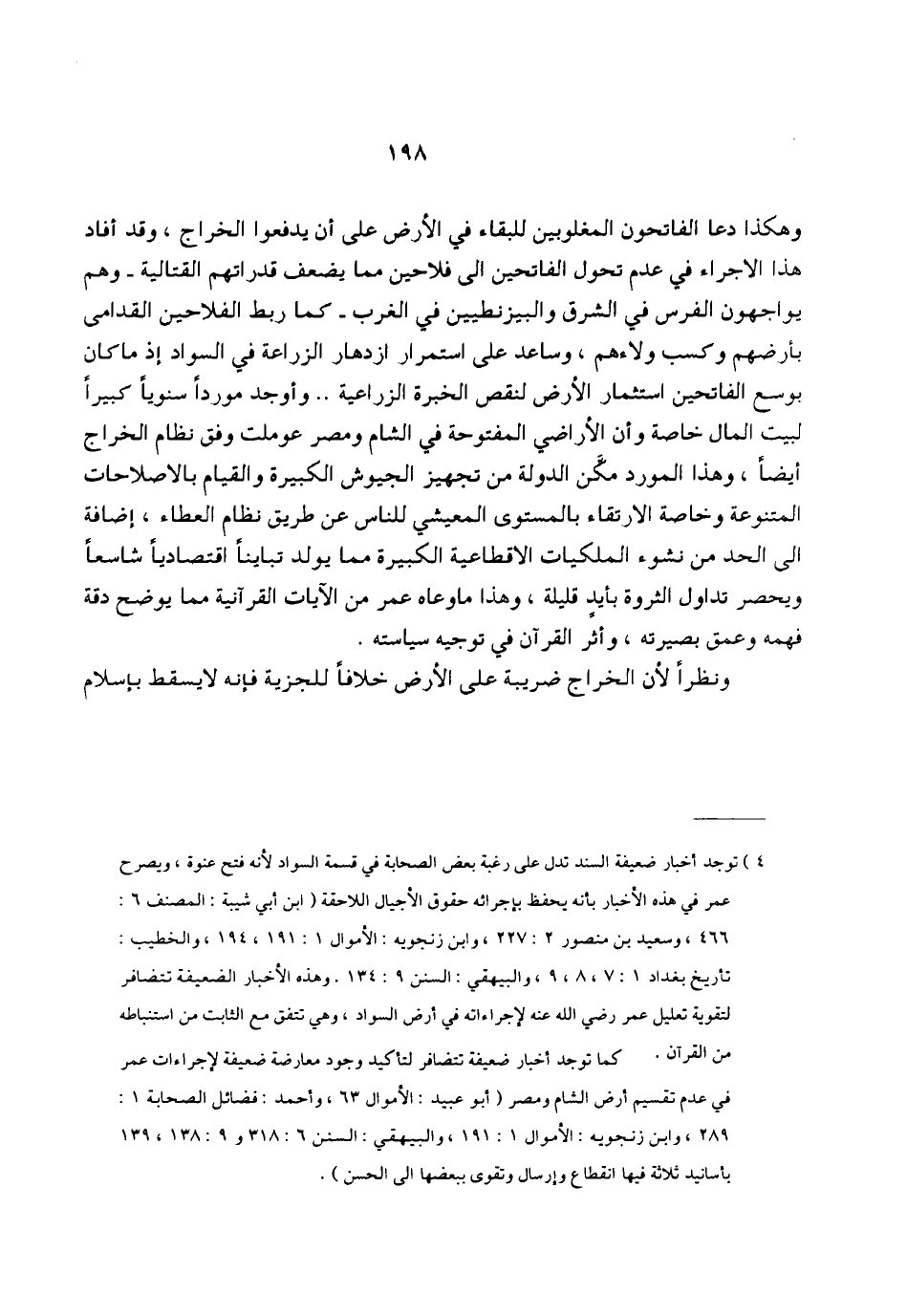 (¬1) توجد أخبار ضعيفة السند تدل على رغبة بعض الصحابة في قسمة السواد لأنه فتح عنوة، ويصرح عمر في هذه الأخبار بأنه يحفظ بإجرائه حقوق الأجيال اللاحقة (ابن أبي شيبة: المصنف 6: 466، وسعيد بن منصور 2: 227، وابن زنجويه: الأموال 1: 191، 194، والخطيب: تأريخ بغداد 1: 7، 8، 9، والبيهقي: السنن 9: 134. وهذه الأخبار الضعيفة تتضافر لتقوية تعليل عمر رضي الله عنه لإجراءاته في أرض السواد، وهي تتفق مع الثابت من استنباطه من القرآن. كما توجد أخبار ضعيفة تتضافر لتأكيد وجود معارضة ضعيفة لإجراءات عمر في عدم تقسيم أرض الشام ومصر (أبو عبيد: الأموال 63، وأحمد: فضائل الصحابة 1: 289، وابن زنجويه: الأموال 1: 191، والبيهقي: السنن 6: 318 و 9: 138، 139 بأسانيد ثلاثة فيها انقطاع وإرسال وتقوى ببعضها إلى الحسن).