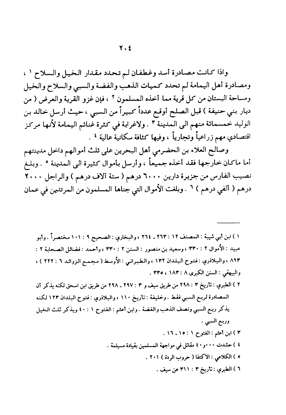 واذا كانت مصادرة أسد وغطفان لم تحدد مقدار الخيل والسلاح (¬1)، ومصادرة أهل اليمامة لم تحدد كميات الذهب والفضة والسبي والسلاح والخيل ومساحة البستان من كل قرية مما أخذه المسلمون (¬2)، فإن غزو القرية والعرض (من ديار بني حنيفة) قبل الصلح أوقع عدداً كبيراً من السبي، حيث أرسل خالد بن الوليد خمسمائة منهم إلى المدينة (¬3). ولا غرابة في كثرة غنائم اليمامة لأنها مركز اقتصادي مهم زراعياً وتجارياً، وفيها كثافة سكانية عالية (¬4).