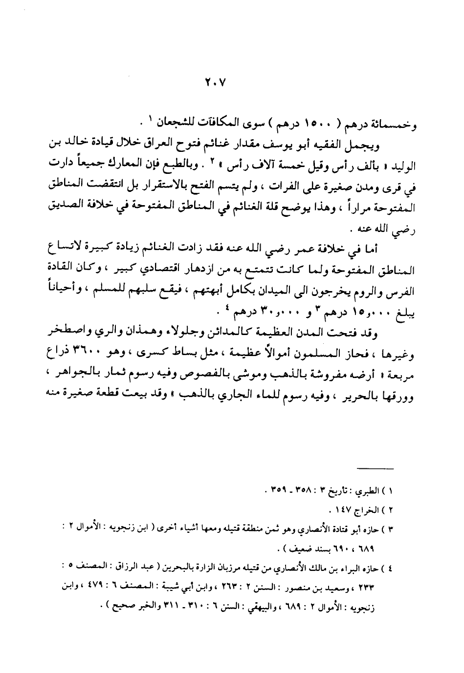 (¬4) حازه البراء بن مالك الأنصاري من قتيله مرزبان الزارة بالبحرين (عبد الرزاق: المصنف 5: 233، وسعيد بن منصور: السنن 2: 263، وابن أبي شيبة: المصنف 6: 479، وابن زنجويه: الأموال 2: 689، والبيهقي: السنن 6: 310 - 311 والخبر صحيح).