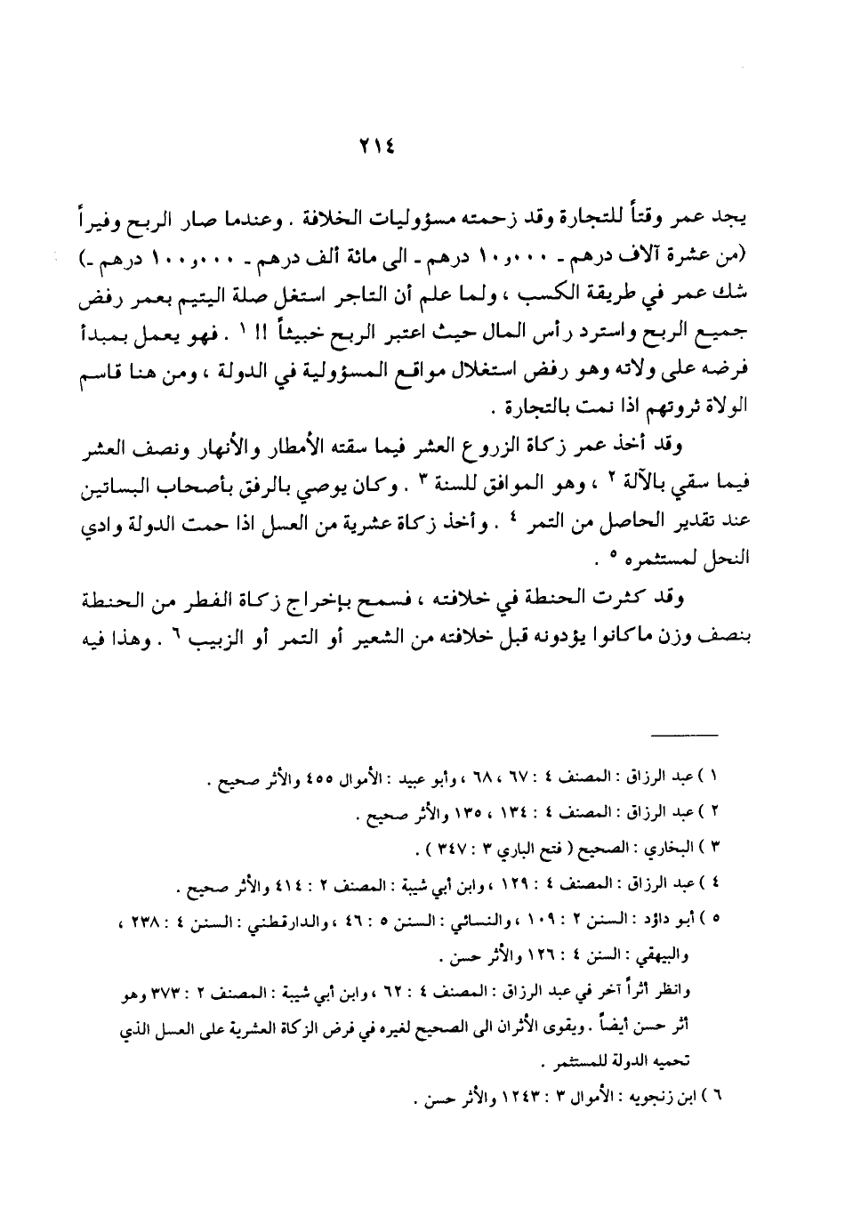 وانظر أثراً آخر في عبد الرزاق: المصنف 4: 62، وابن أبي شيبة: المصنف 2: 373 وهو اثر حسن أيضاً. ويقوى الأثران إلى الصحيح لغيره في فرض الزكاة العشرية على العسل الذي تحميه الدولة للمستثمر.
