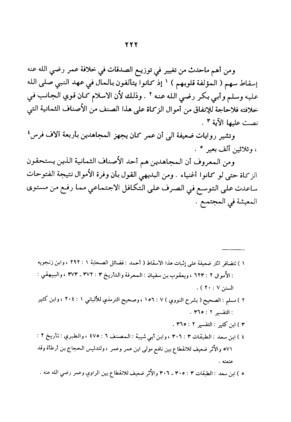 ومن أهم ما حدث من تغيير في توزيع الصدقات في خلافة عمر رضي الله عنه إسقاط سهم (المؤلفة قلوبهم) (¬1) إذ كانوا يتألفون بالمال في عهد النبي صلى الله عليه وسلم وأبي بكر رضي الله عنه (¬2). وذلك لأن الإسلام كان قوي الجانب في خلافته فلا حاجة للإنفاق من أموال الزكاة على هذا الصنف من الأصناف الثمانية التي نصت عليها الآية (¬3).