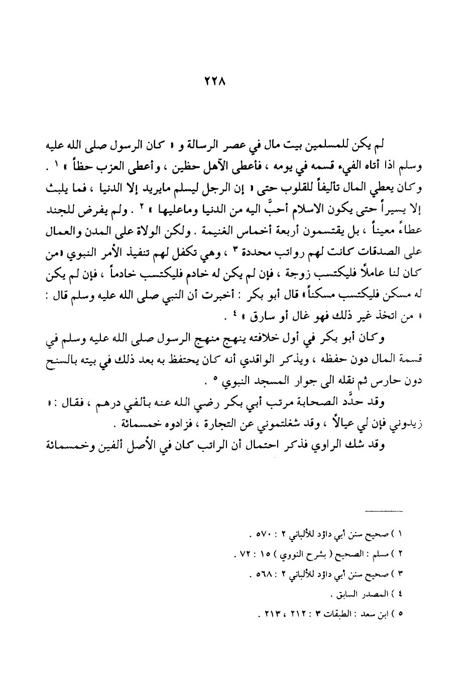 لم يكن للمسلمين بيت مال في عصر الرسالة و "كان الرسول صلى الله عليه وسلم إذا أتاه الفيء قسمه في يومه، فأعطى الآهل حظين، وأعطى العزب حظاً" (¬1). وكان يعطي المال تأليفاً للقلوب حتى "إن الرجل ليسلم ما يريد إلا الدنيا، فما يلبث الا يسيراً حتى يكون الإسلام أحبَّ إليه من الدنيا وما عليها" (¬2). ولم يفرض للجند عطاء معيناً، بل يقتسمون أربعة أخماس الغنيمة. ولكن الولاة على المدن والعمال على الصدقات كانت لهم رواتب محددة (¬3)، وهي تكفل لهم تنفيذ الأمر النبوي "من كان لنا عاملاً فليكتسب زوجة، فإن لم يكن له خادم فليكتسب خادماً، فإن لم يكن له مسكن فليكتسب مسكناً" قال أبو بكر: أخبرت أن النبي صلى الله عليه وسلم قال: "من اتخذ غير ذلك فهو غال أو سارق" (¬4).