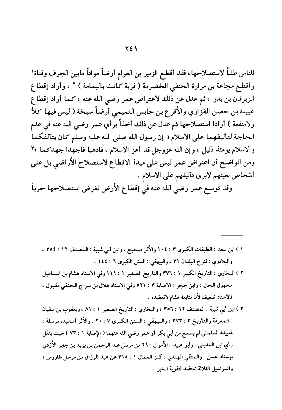 (¬3) ابن أبي شيبة: المصنف 12: 356، والبخاري: التأريخ الصغير 1: 81، ويعقوب بن سفيان: المعرفة والتأريخ 3: 373، والبيهقي: السنن الكبرى 7: 20. والأثر أسانيده مرسلة، فعبيدة السلماني لم يسمع من أبي بكر أو عمر رضي الله عنهما (الإصابة 1: 73) حيث ينقل رأي ابن المديني. وأبو عبيد: الأموال 290 من مرسل عبد الرحمن بن يزيد بن جابر الأزدي بإسناد حسن. والمتقي الهندي: كنز العمال 1: 315 عن عبد الرزاق من مرسل طاووس، والمراسيل الثلاثة تعتضد لتقوية الخبر.