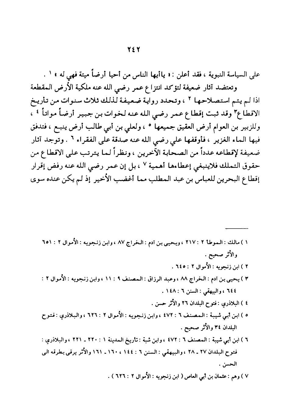 (¬3) يحيى بن آدم: الخراج 88، وعبد الرزاق: المصنف 9: 11، وابن زنجويه: الأموال 2: 644، والبيهقي: السنن 6: 148.