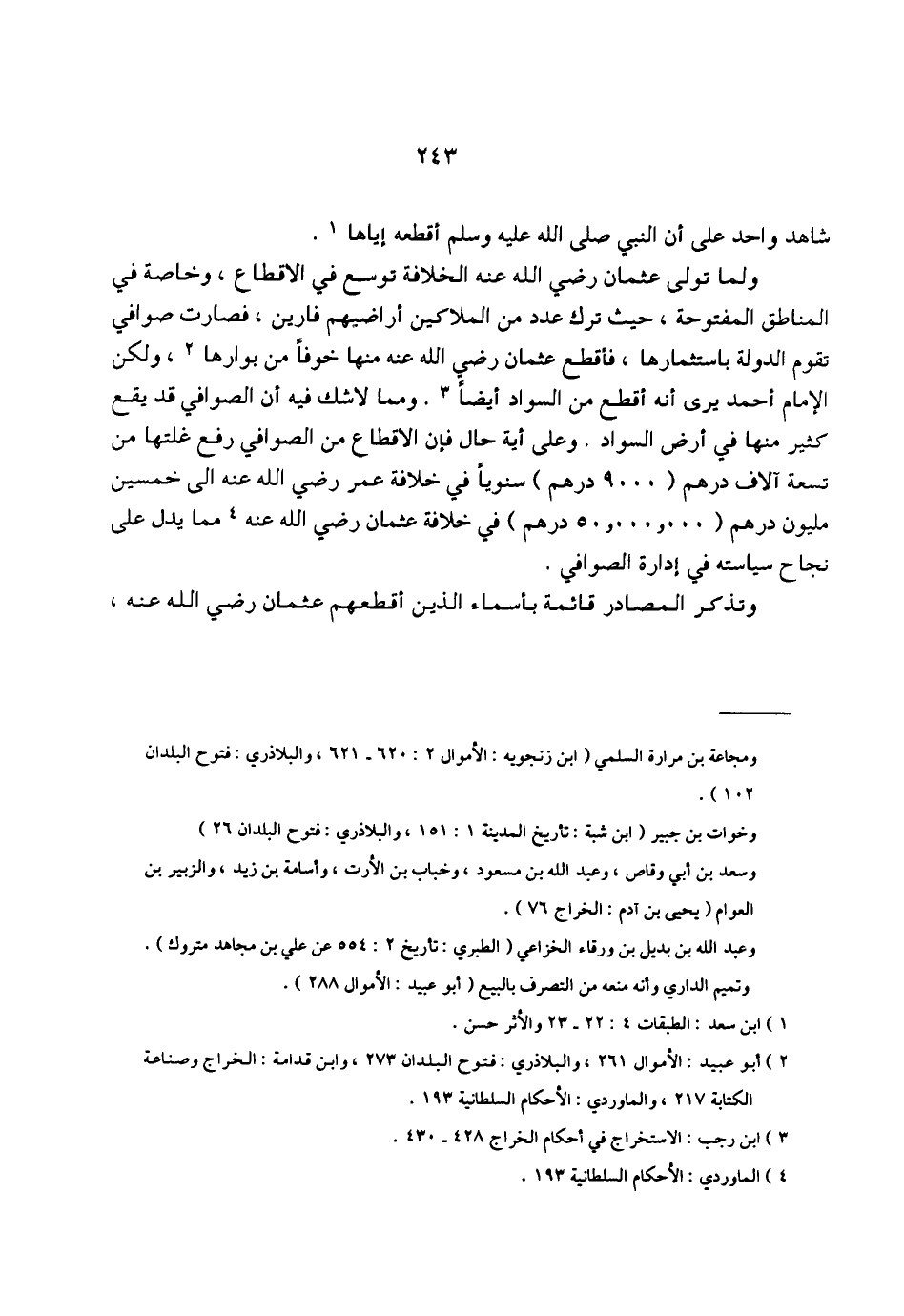 ولما تولى عثمان رضي الله عنه الخلافة توسع في الإقطاع، وخاصة في المناطق المفتوحة، حيث ترك عدد من الملاكين أراضيهم فارين، فصارت صوافي تقوم الدولة باستثمارها، فأقطع عثمان رضي الله عنه منها خوفاً من بوارها (¬2)، ولكن الإمام أحمد يرى أنه أقطع من السواد أيضاً (¬3). ومما لاشك فيه أن الصوافي قد يقع كثير منها في أرض السواد. وعلى أية حال فإن الإقطاع من الصوافي رفع غلتها من تسعة آلاف درهم (9000 درهم) سنوياً في خلافة عمر رضي الله عنه إلى خمسين مليون درهم (000, (000) , (50) درهم) في خلافة عثمان رضي الله عنه (¬4) مما يدل على نجاح سياسته في إدارة الصوافي.
