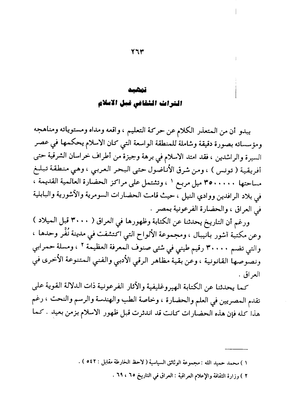 ورغم أن التاريخ يحدثنا عن الكتابة وظهورها في العراق (3000 قبل الميلاد) وعن مكتبة آشور بانيبال، ومجموعة الألواح التي اكتشفت في مدينة نُفَّر وحدها، والتي تضم (30000) رقيم طيني في شتى صنوف المعرفة العظيمة (¬2)، ومسلة حمرابي ونصوصها القانونية، وعن بقية مظاهر الرقي الأدبي والفني المتنوعة الأخرى في العراق.