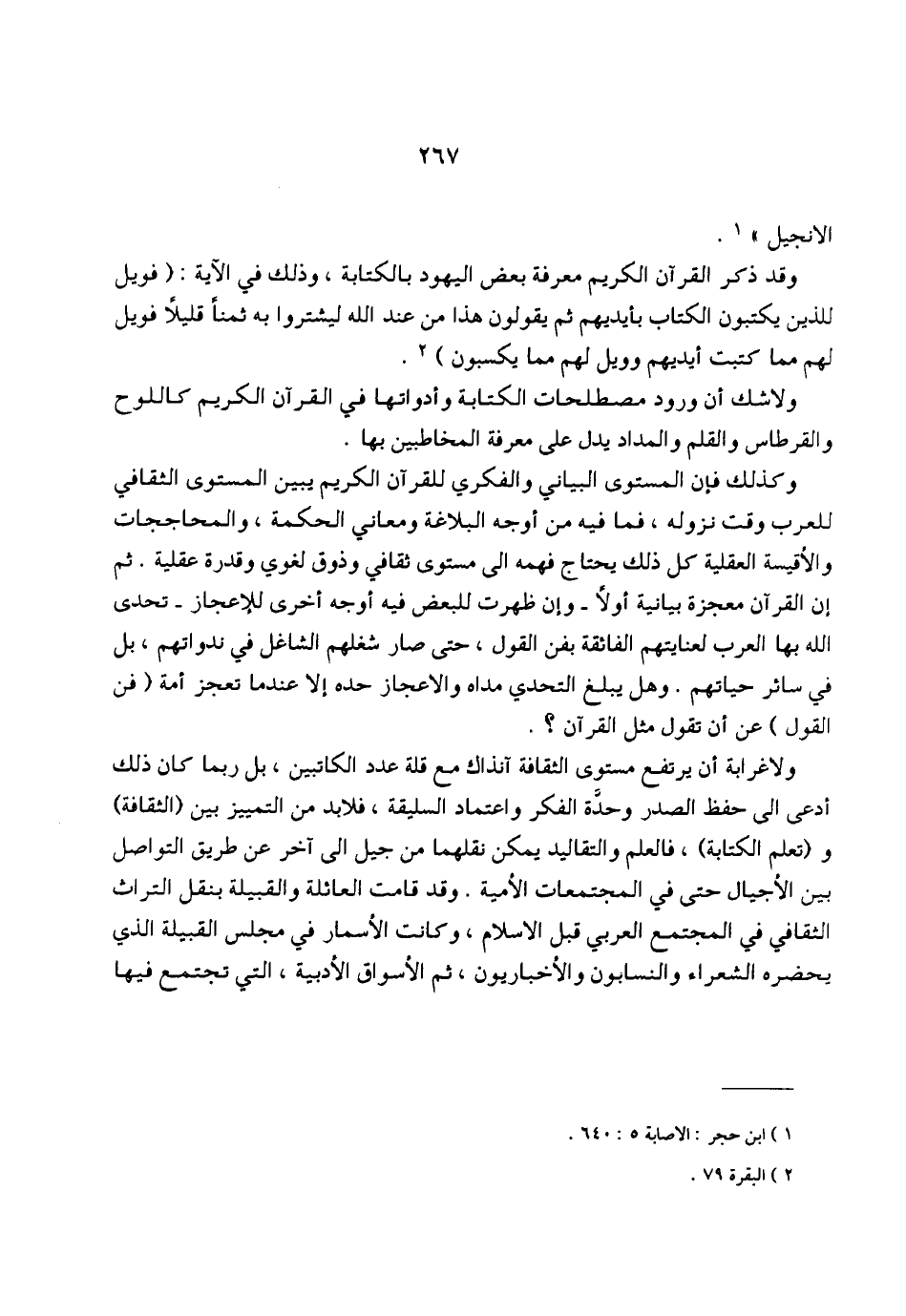 وكذلك فإن المستوى البياني والفكري للقرآن الكريم يبين المستوى الثقافي للعرب وقت نزوله، فما فيه من أوجه البلاغة ومعاني الحكمة، والمحاججات والأقيسة العقلية كل ذلك يحتاج فهمه إلى مستوى ثقافي وذوق لغوي وقدرة عقلية. ثم إن القرآن معجزة بيانية أولاً- وإن ظهرت للبعض فيه أوجه أخرى للإعجاز- تحدى الله بها العرب لعنايتهم الفائقة بفن القول، حتى صار شغلهم الشاغل في ندواتهم، بل في سائر حياتهم. وهل يبلغ التحدي مداه والإعجاز حده إلا عندما تعجز أمة (فن القول) عن أن تقول مثل القرآن؟.