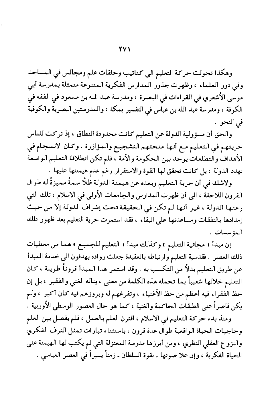 ولا شك في أن حرية التعليم وبعده عن هيمنة الدولة ظلاَّ سمةً مميزةً له طوال القرون اللاحقة، إلى أن ظهرت المدارس والجامعات الأولى في الإسلام، تلك التي رعتها الدولة، غير أنها لم تكن في الحقيقة تحت إشراف الدولة إلا من حيث إمدادها بالنفقات ومساعدتها على البقاء، فقد استمرت حرية التعليم بعد ظهور تلك المؤسسات.