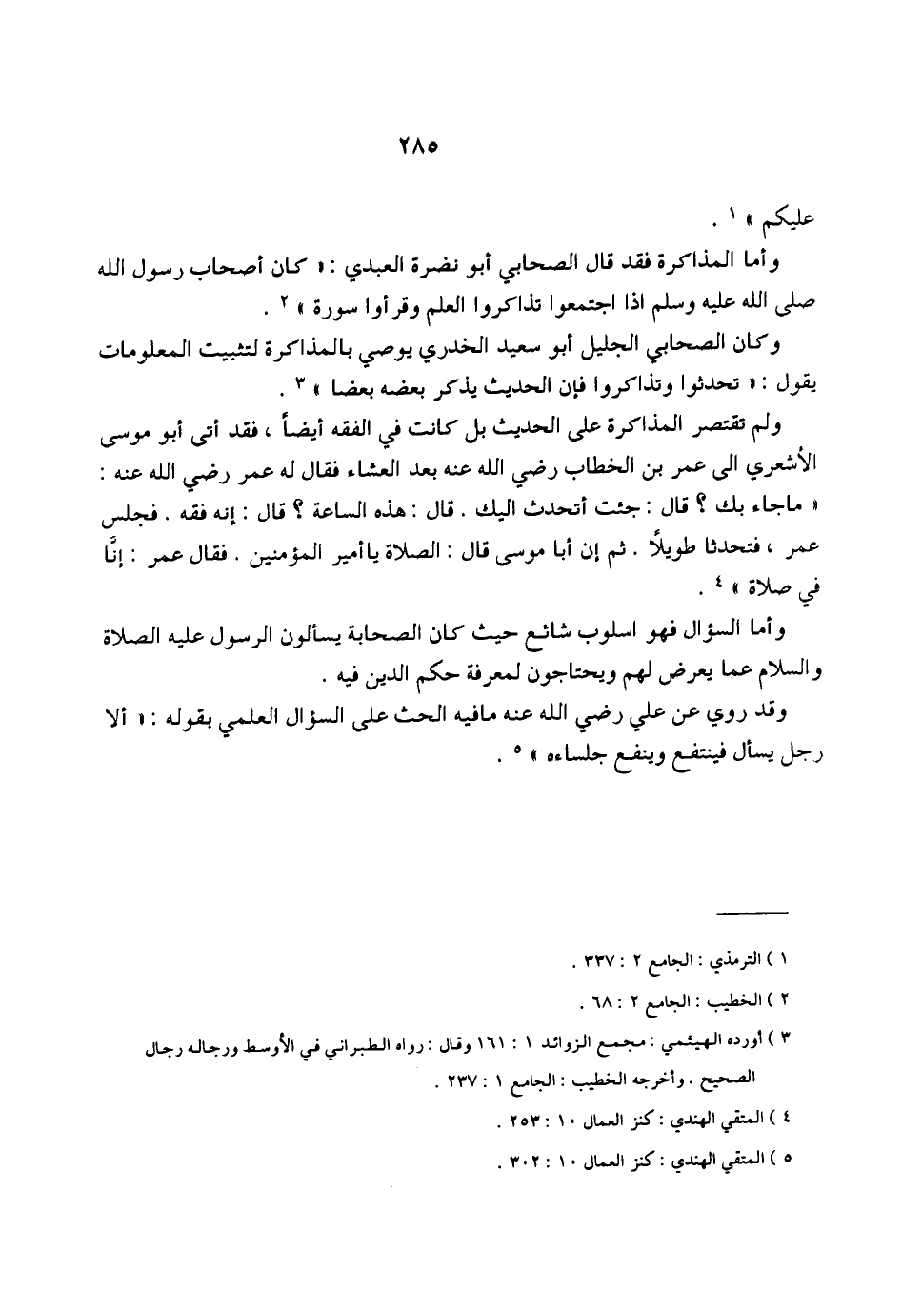 ولم تقصر المذاكرة على الحديث بل كانت في الفقه أيضاً، فقد أتى أبو موسى الأشعري إلى عمر بن الخطاب رضي الله عنه بعد العشاء فقال له عمر رضي الله عنه: "ما جاء بك؟ قال: جئت أتحدث إليك. قال: هذه الساعة؟ قال: إنه فقه. فجلس عمر، فتحدثا طويلاً. ثم إن أبا موسى قال: الصلاة يا أمير المؤمنين. فقال عمر: إنَّا في صلاة" (¬4).
