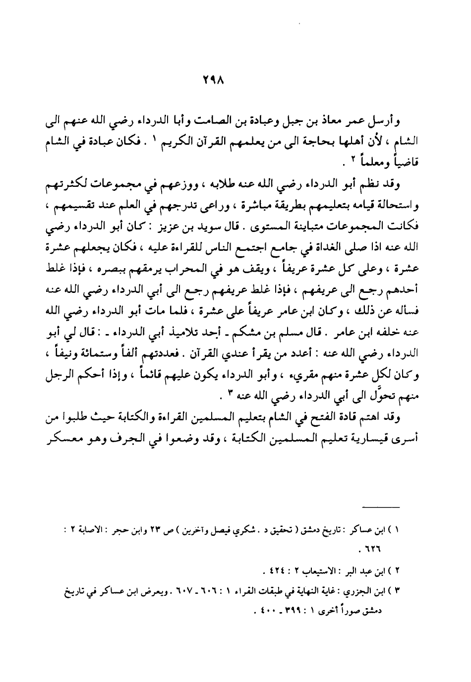 وأرسل عمر معاذ بن جبل وعبادة بن الصامت وأبا الدرداء رضي الله عنهم إلى الشُام، لأن أهلها بحاجة إلى من يعلمهم القرآن الكريم (¬1). فكان عبادة في الشام قاضياً ومعلماً (¬2).