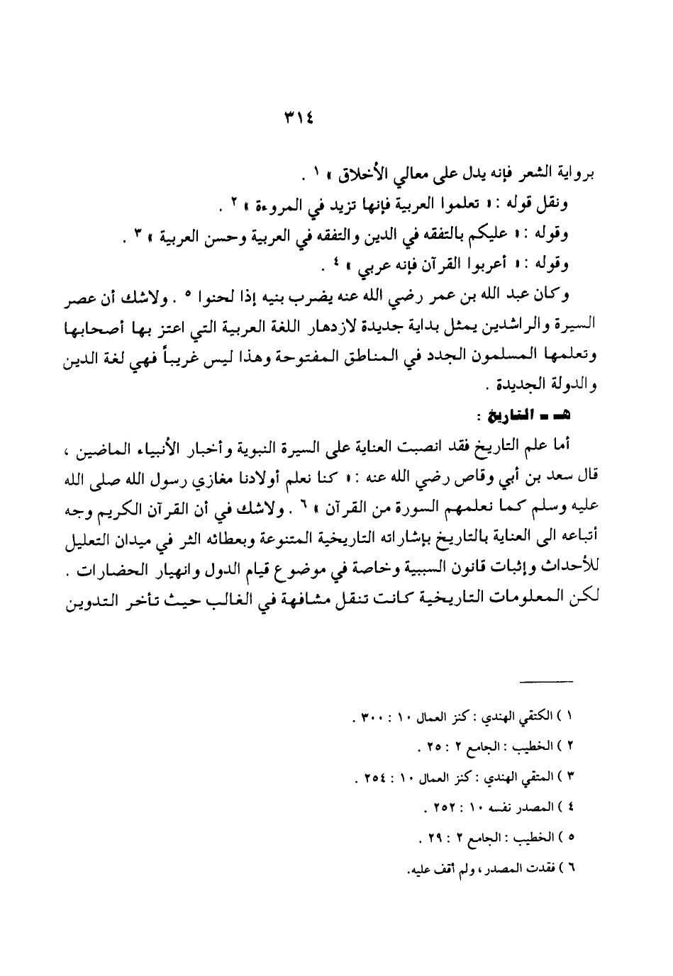 أما علم التاريخ فقد انصبت العناية على السيرة النبوية وأخبار الأنبياء الماضين، قال سعد بن أبي وقاص رضي الله عنه: "كنا نعلم أولادنا مغازي رسول الله صلى الله عليه وسلم كما نعلمهم السورة من القرآن" (¬6). ولا شك في أن القرآن الكريم وجه أتباعه إلى العناية بالتاريخ بإشاراته التاريخية المتنوعة وبعطائه الثر في ميدان التعليل للأحداث وإثبات قانون السببية وخاصة في موضوع قيام الدول وانهيار الحضارات. لكن المعلومات التاريخية كانت تنقل مشافهة في الغالب حيث تأخر التدوين