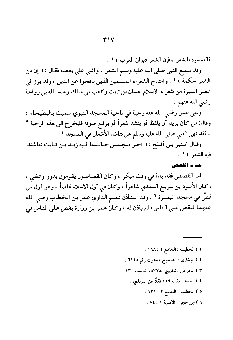 وقد سمع النبي صلى الله عليه وسلم الشعر، وأثنى على بعضه فقال: "إن من الشعر حكمة" (¬2). وامتدح الشعراء المسلمين الذين نافحوا عن الدين، وقد برز في عصر السيرة من شعراء الاسلام حسان بن ثابت وكعب بن مالك وعبد الله بن رواحة رضي الله عنهم.