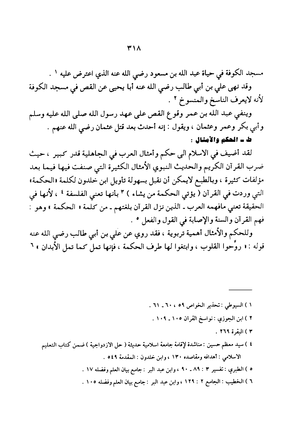 وقد نهى علي بن أبي طالب رضي الله عنه أبا يحيى عن القص في مسجد الكوفة لأنه لا يعرف الناسخ والمنسوخ (¬2).