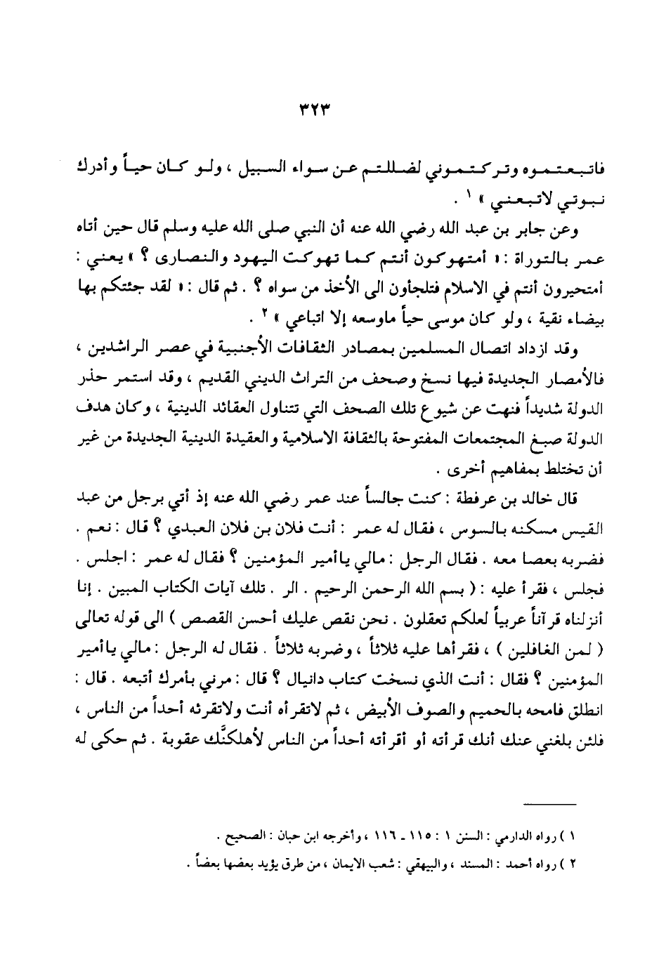 قال خالد بن عرفطة: كنت جالساً عند عمر رضي الله عنه إذ أتي برجل من عبد القيس مسكنه بالسوس، فقال له عمر: أنت فلان بن فلان العبدي؟ قال: نعم. فضربه بعصا معه. فقال الرجل: مالي يا أمير المؤمنين؟ فقال له عمر: اجلس. فجلس، فقرأ عليه: {بسم الله الرحمن الرحيم. الر. تلك آيات الكتاب المبين. إنا أنزلناه قرآناً عربياً لعلكم تعقلون. نحن نقص عليك أحسن القصص} إلى قوله تعالى (لمن الغافلين)، فقرأها عليه ثلاثاً، وضربه ثلاثاً. فقال له الرجل: مالي يا أمير المؤمنين؟ فقال: أنت الذي نسخت كتاب دانيال؟ قال: مرني بأمرك أتبعه. قال: انطلق فامحه بالحميم والصوف الأبيض، ثم لا تقرأه أنت ولا تقرئه أحداً من الناس، فلئن بلغني عنك أنك قرأته أو أقرأته أحداً من الناس لأهلكنَّك عقوبة. ثم حكي له