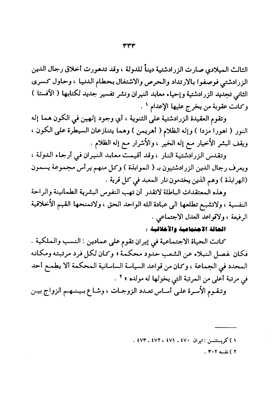 الثالث الميلادي صارت الزرادشتية ديناً للدولة، وقد تدهورت أخلاق رجال الذين الزرادشتي فوصفوا بالارتداد والحرص والاشتغال بحطام الدنيا، وحاول كسرى الثاني تجديد الزرادشتية وإحياء معابد النيران ونشر تفسير جديد لكتابها (الآفستا) وكانت عقوبة من يخرج عليها الإعدام (¬1).
