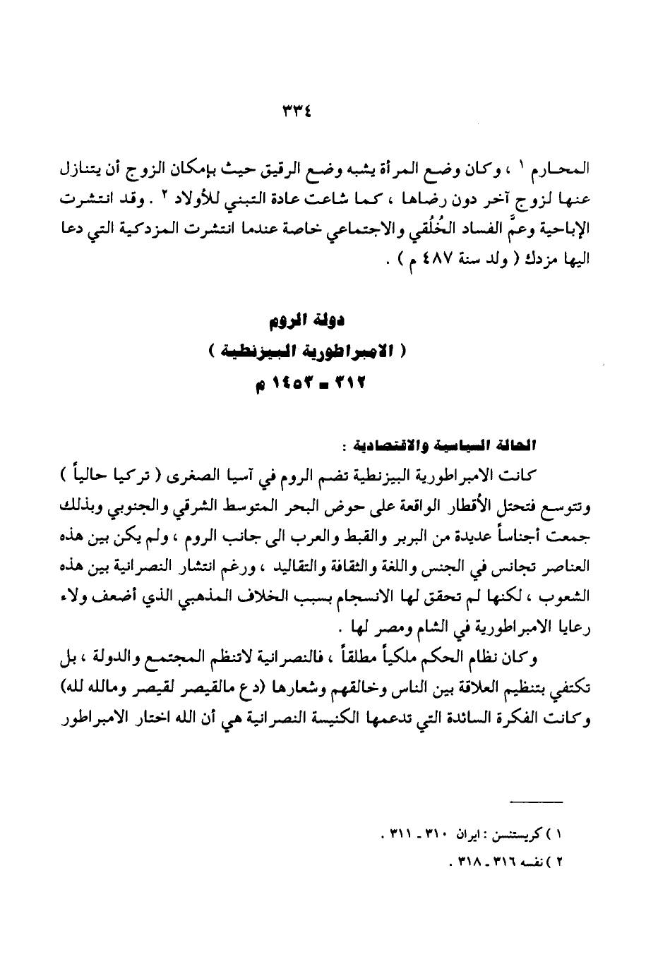 المحارم (¬1)، وكان وضع المرأة يشبه وضع الرقيق حيث بإمكان الزوج أن يتنازل عنها لزوج آخر دون رضاها، كما شاعت عادة التبني للأولاد (¬2). وقد انتشرت الإباحية وعم الفساد الخُلُقي والاجتماعي خاصة عندما انتشرت المزدكية التي دعا إليها مزدك (ولد سنة (487) م).