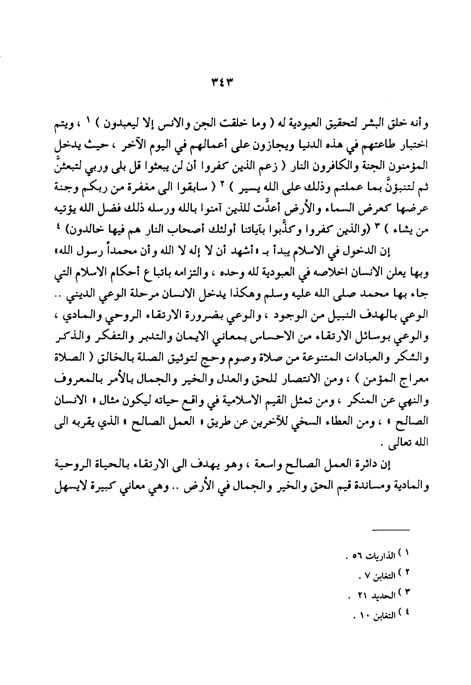 إن الدخول في الاسلام يبدأ بـ "أشهد أن لا إله لا الله وأن محمداً رسول الله" وبها يعلن الانسان اخلاصه في العبودية لله وحده، والتزامه باتباع أحكام الاسلام التي جاء بها محمد صلى الله عليه وسلم وهكذا يدخل الانسان مرحلة الوعي الديني .. الوعي بالهدف النبيل من الوجود، والوعي بضرورة الارتقاء الروحي والمادي، والوعي بوسائل الارتقاء من الإحساس بمعاني الإيمان والتدبر والتفكر والذكر والشكر والعبادات المتنوعة من صلاة وصوم وحج لتوثيق الصلة بالخالق (الصلاة معراج المؤمن)، ومن الانتصار للحق والعدل والخير والجمال بالأمر بالمعروف والنهي عن المنكر، ومن تمثل القيم الاسلامية في واقع حياته ليكون مثال "الإنسان الصالح"، ومن العطاء السخي للآخرين عن طريق "العمل الصالح" الذي يقربه إلى الله تعالى.